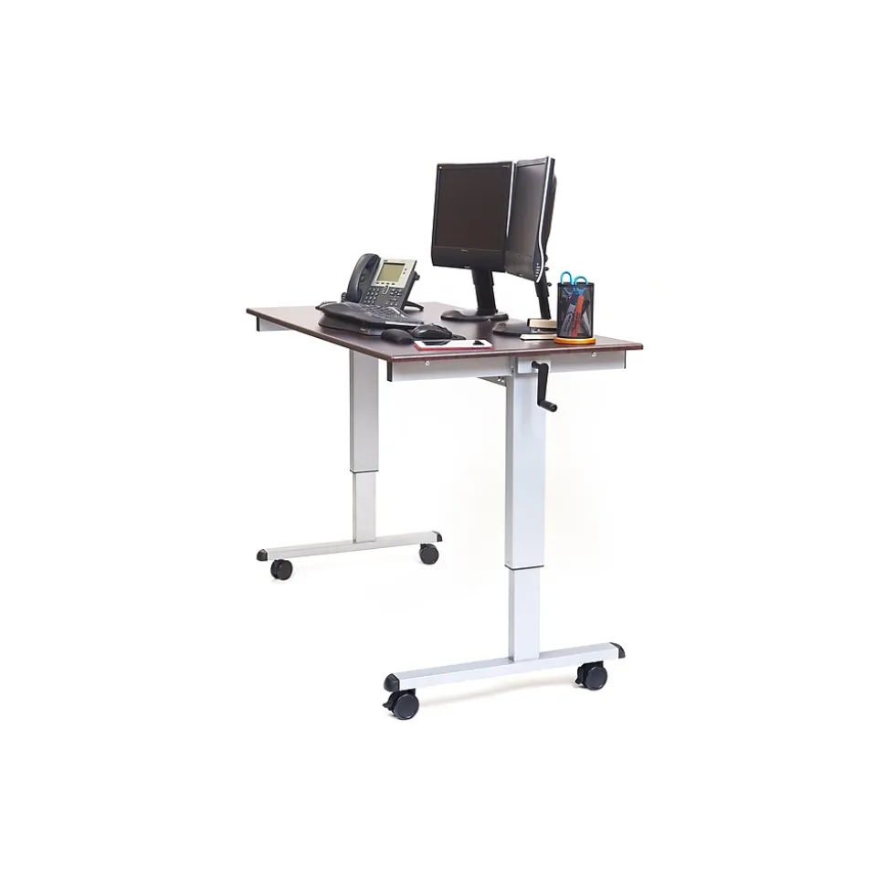 Foster a healthy work environment with this stand-up desk. The steel frame offers stability and is easily height-adjustable with the central crank, and four casters allow for convenient movement from one workspace to another. This Luxor sit and stand desk has a wide surface to accommodate a mobile workstation.