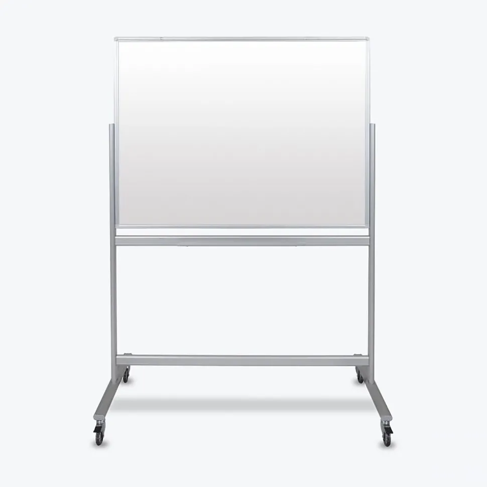 Luxor mobile magnetic glass whiteboards double the writing space and are designed to move easily from location to location making them perfect for collaborative workspaces. The durable aluminum frame and wide base create stability while the super-clear glass offers a bright white surface that is optimal for wet/dry erase markers. This double-sided magnetic glass board presents a contemporary look that complements any office, conference room, training center or classroom, while the 3″ rollerblade-style casters with non-marking treads guarantee smooth mobility. Luxor magnetic glass dry-erase boards are easy to assemble and are packaged with supportive materials that are highly resistant to damage during shipping.