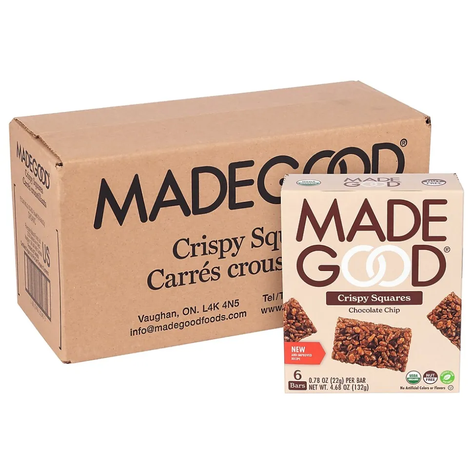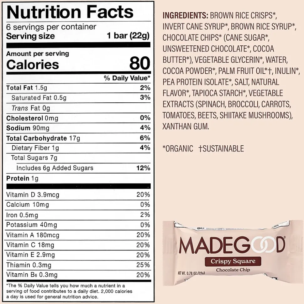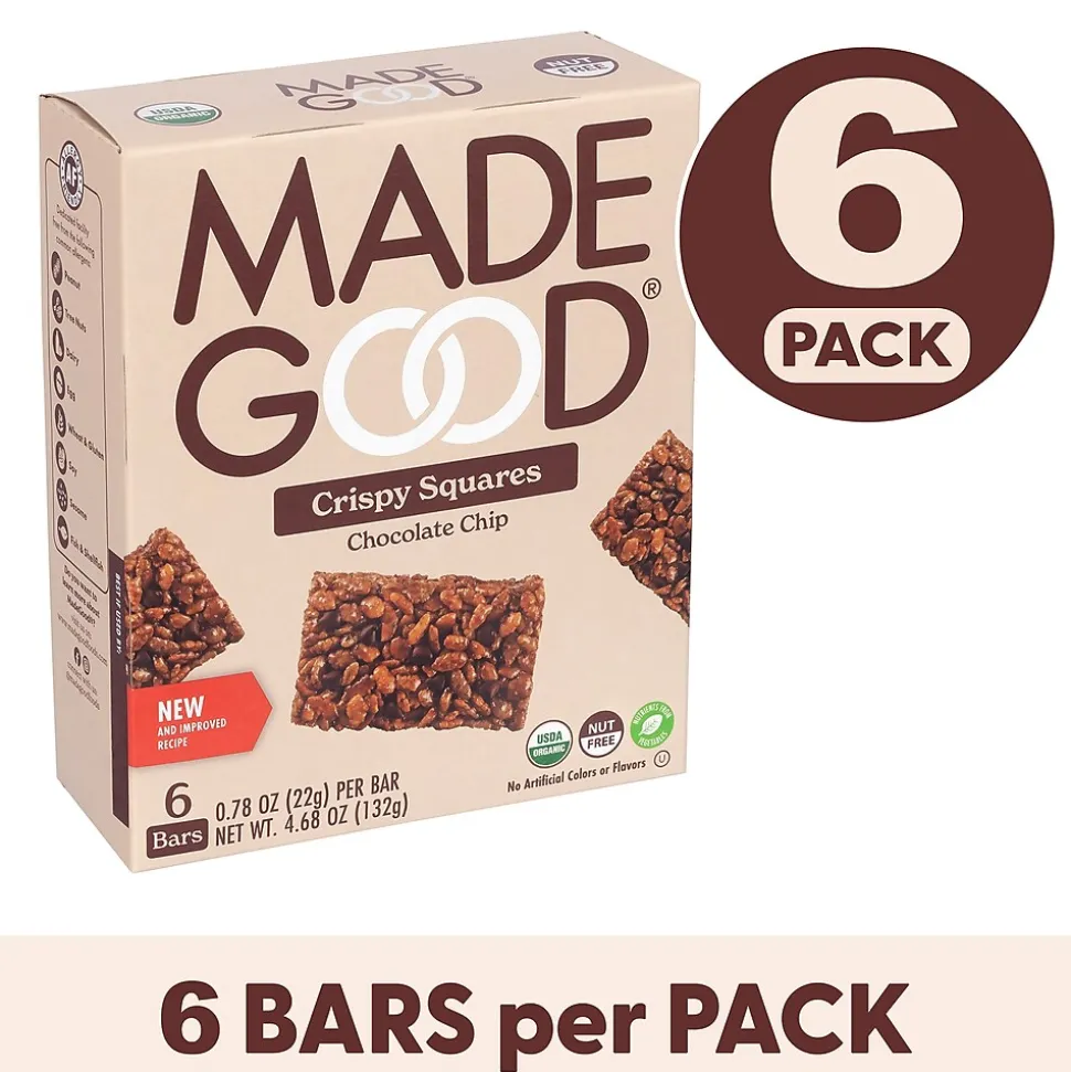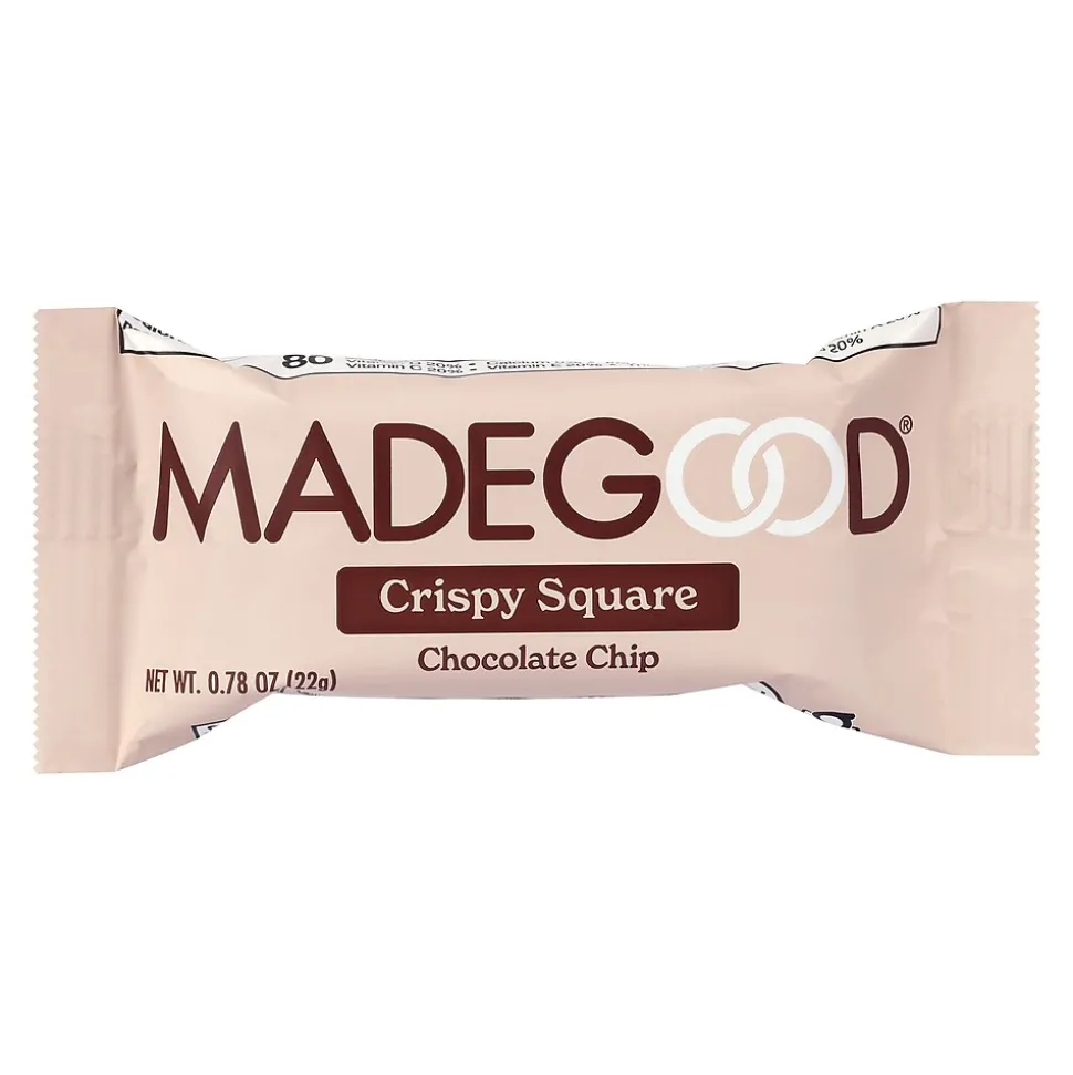 MadeGood Chocolate Chip Crispy Squares are light, crispy and perfectly indulgent snacks for kids and adults alike. Free from the most common allergens, this yummy, healthy food is a safe for school snack.
