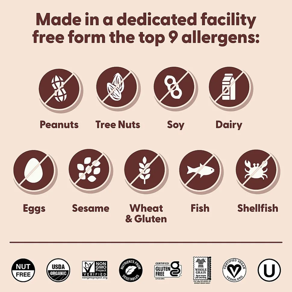 - Savory and sweet and free of the top 8 allergens. They’re nut-free, organic, gluten-free, vegan, non-GMO, and kosher