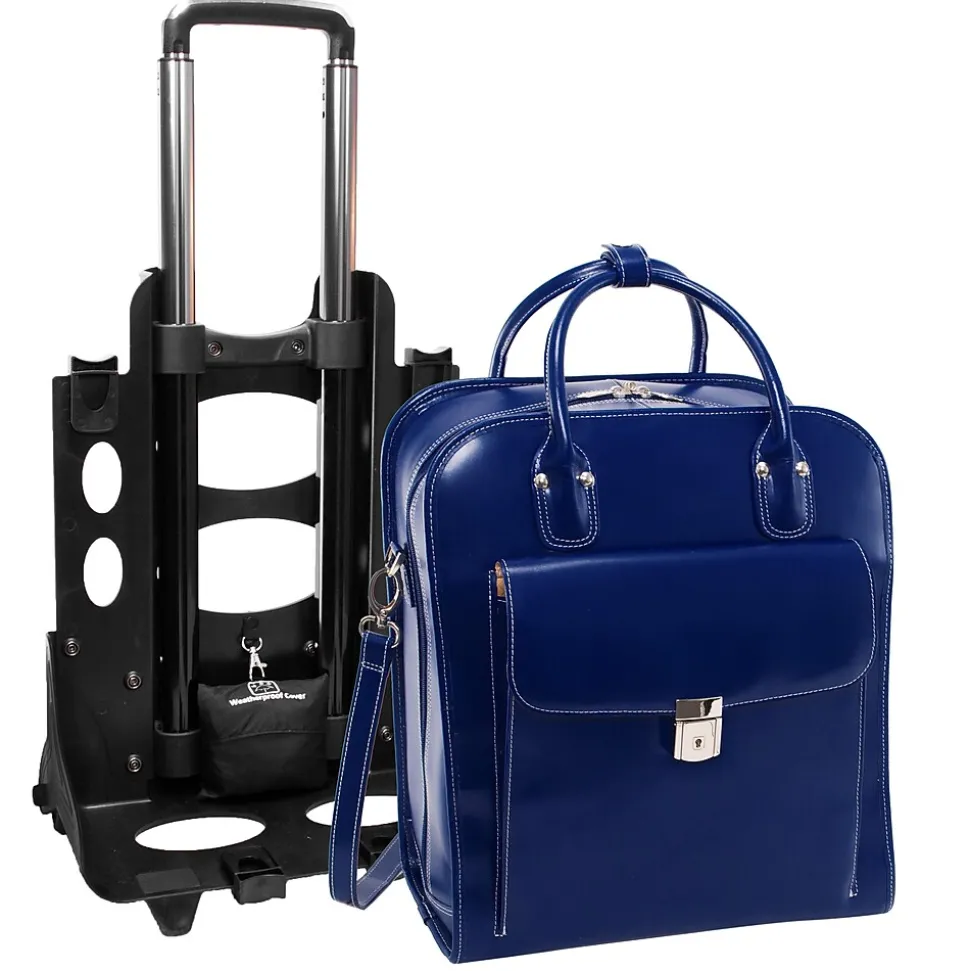 Patented 2-in-1 Detachable Wheel and Handle System briefcase. Vertical, European influenced design allows easier maneuvering in tight, crowded areas. Narrow design also benefits users who travel on planes with the ability to maneuver down aisles without having to lift the bag. Stylish, flap-over front pocket for files and accessories with secure clasp and key lock. Secure, centered zipper pocket within the main compartment. Main compartment features a padded laptop section that fits and protects most laptops up to 15″ in screen size. Main compartment also features an interior organizer, interior zipper pocket and space for files. Removable shoulder strap and weather proof cover included.