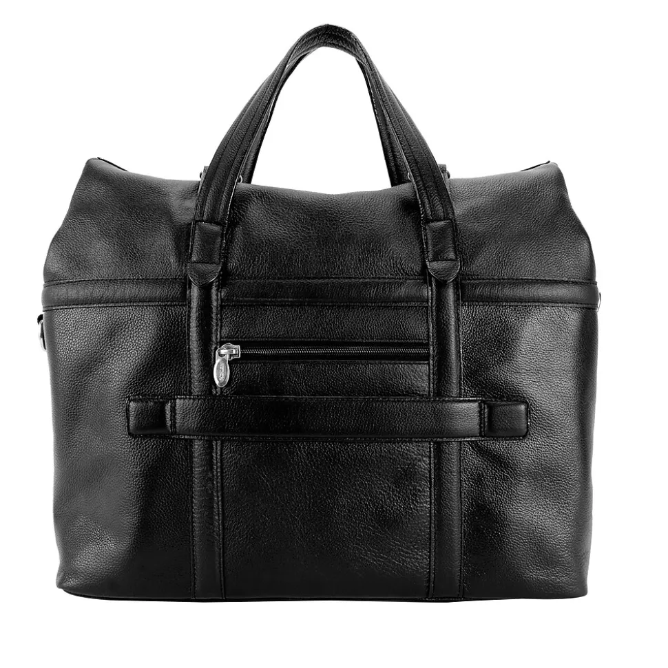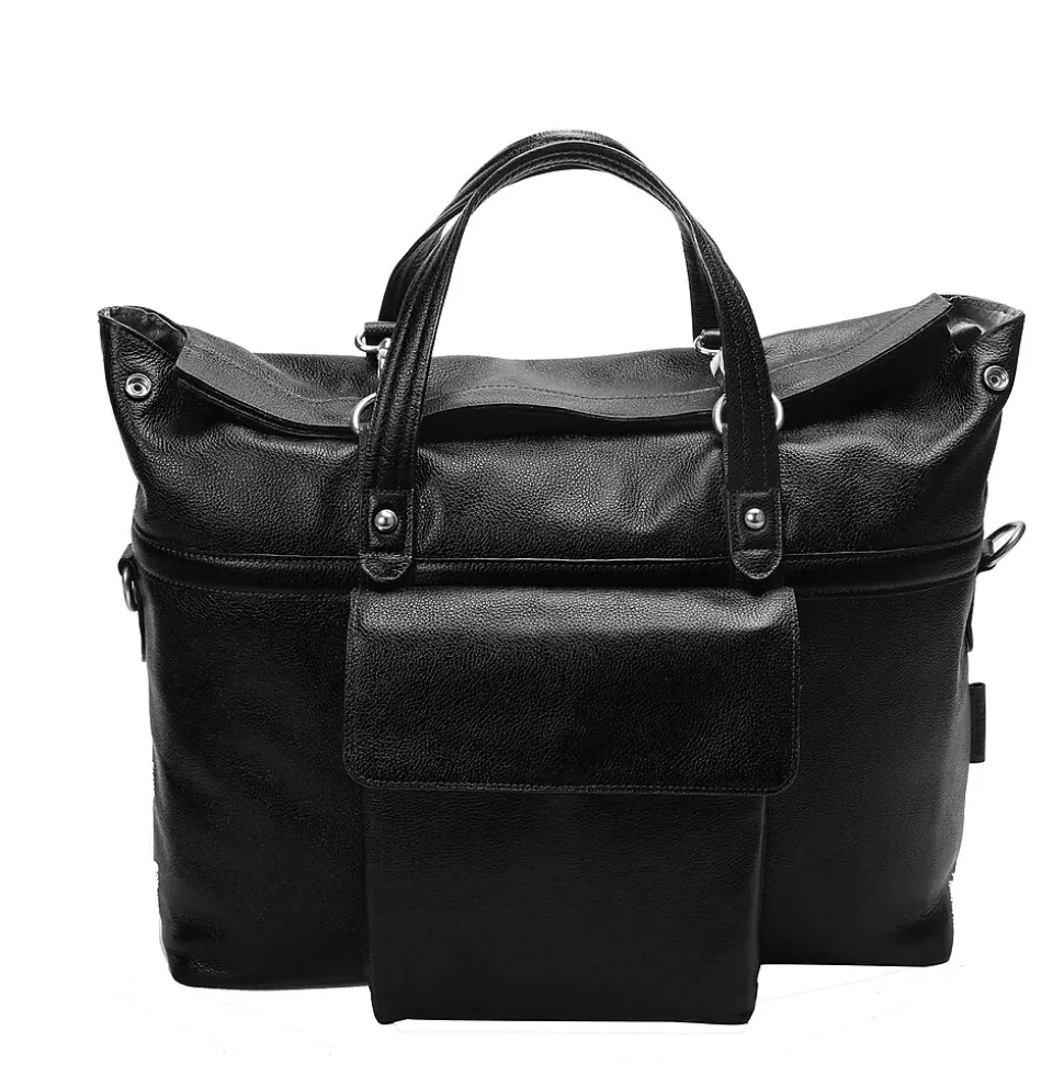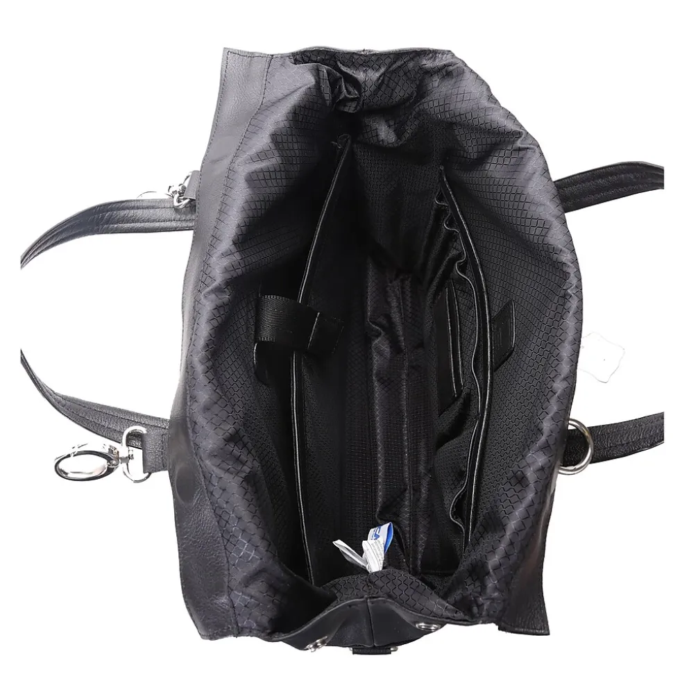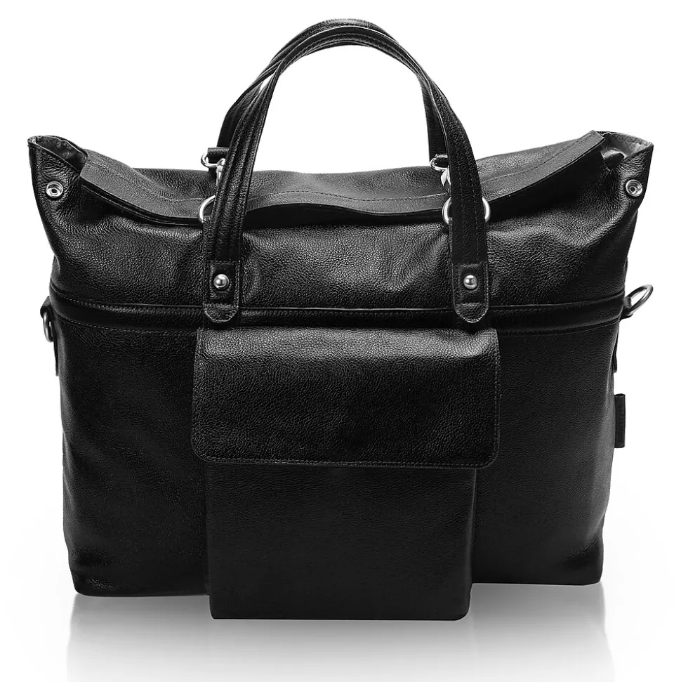 Leather Roll Top Laptop Briefcase with dual clasps closure. Front easy access pocket with flap over magnetic closure. Fully-lined interior with leather trim and silver accent hardware. Interior compartment features built-in laptop protection, tablet pocket and organizer for business cards, pens, and accessories. Back features secured zipper pocket. Removable and adjustable nylon strap with leather shoulder pad. Leather smart strap for piggy-backing onto rolling cases.