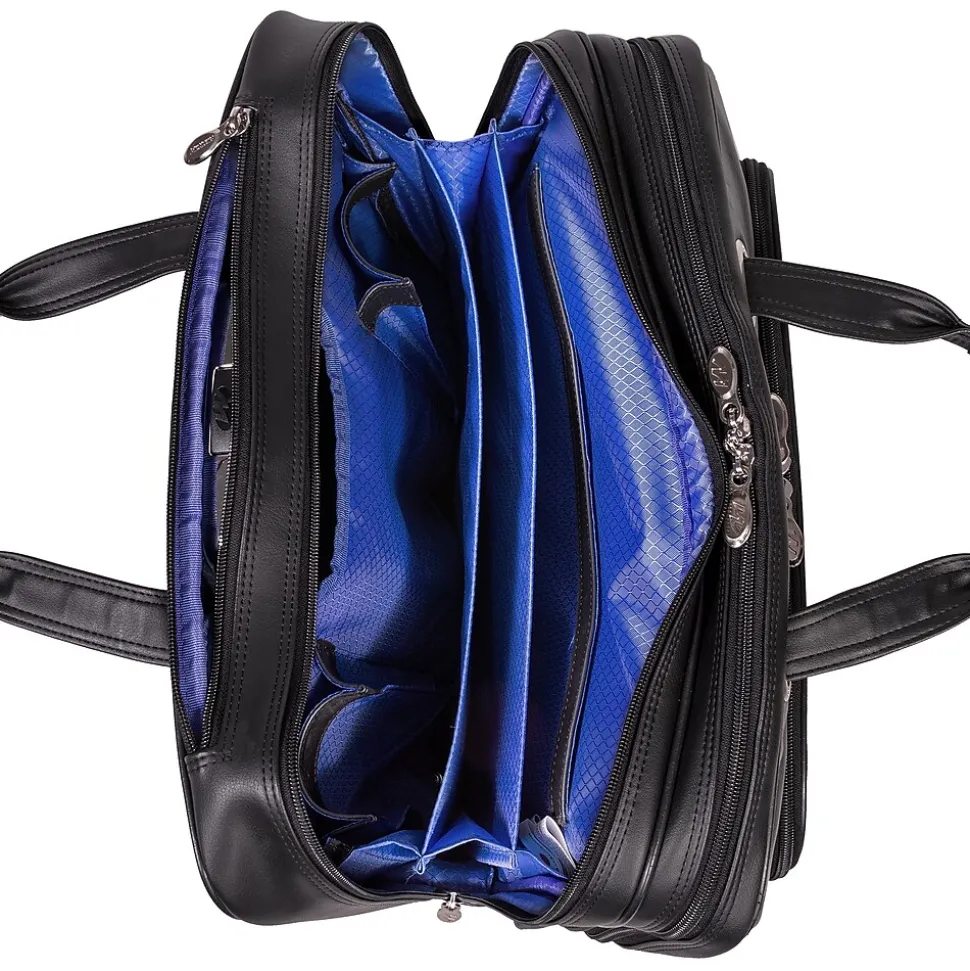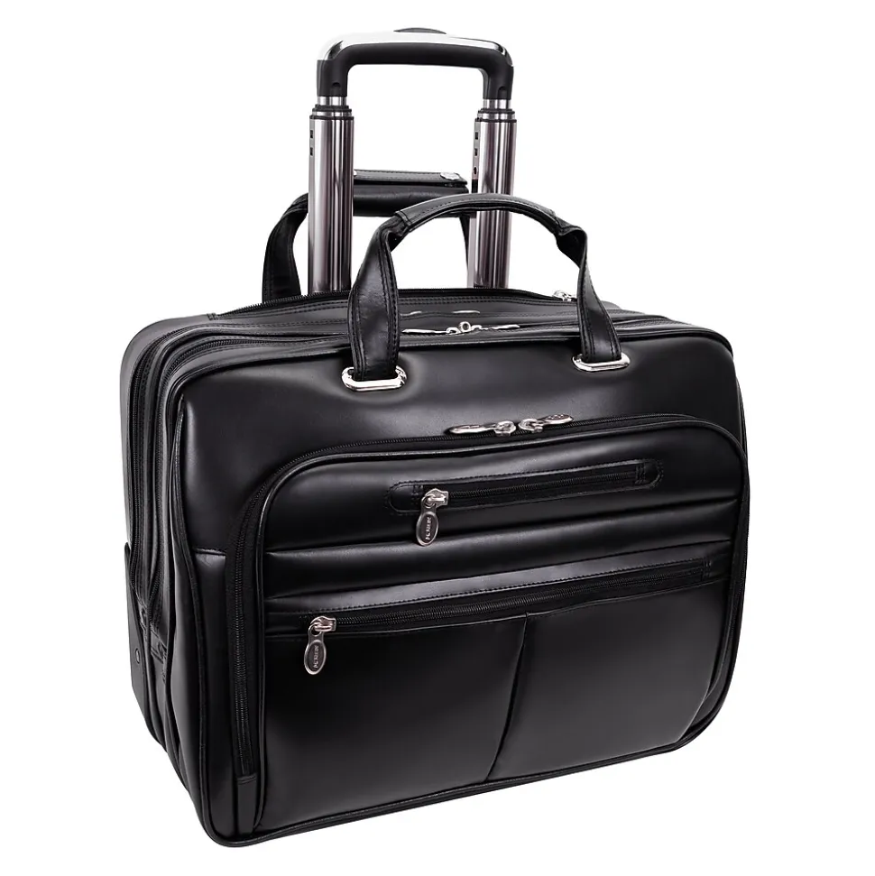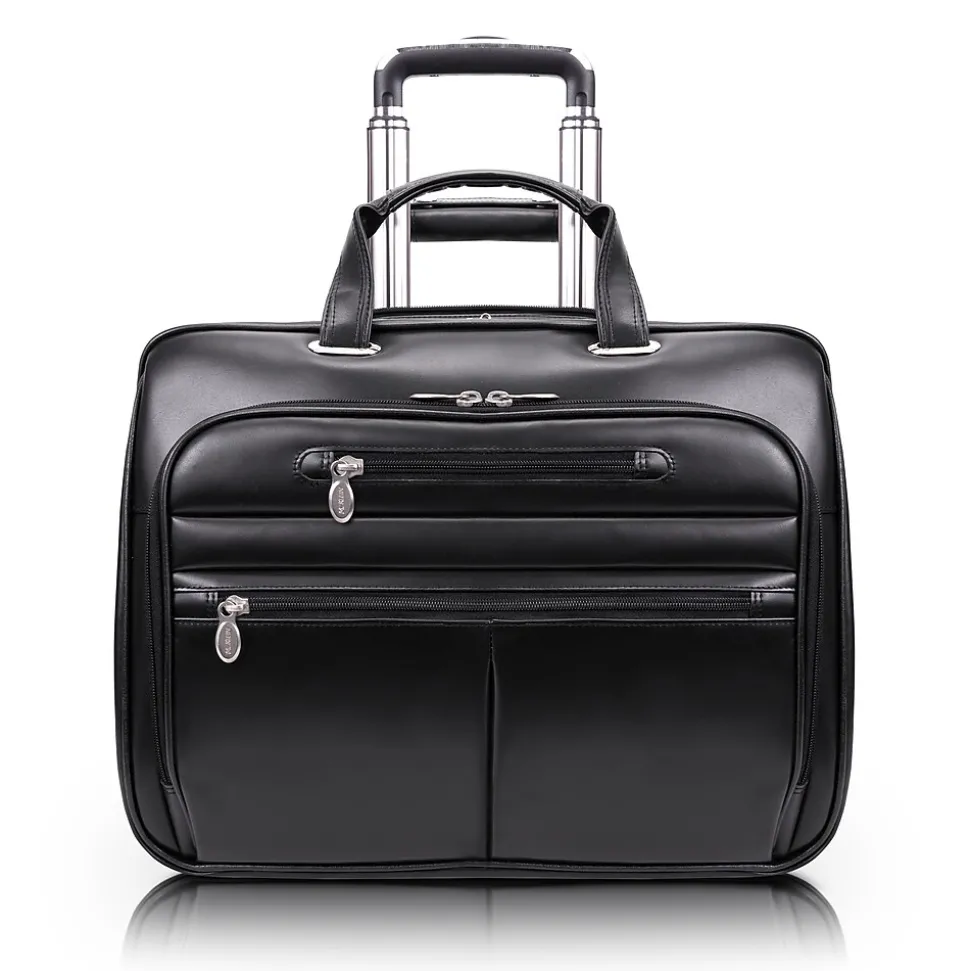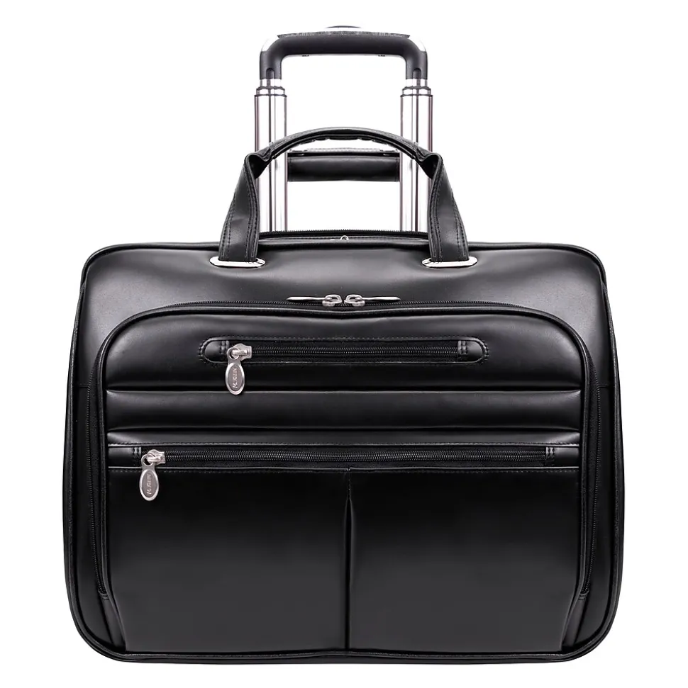 Briefcase with front zipper pockets provide storage space for small miscellaneous items.
