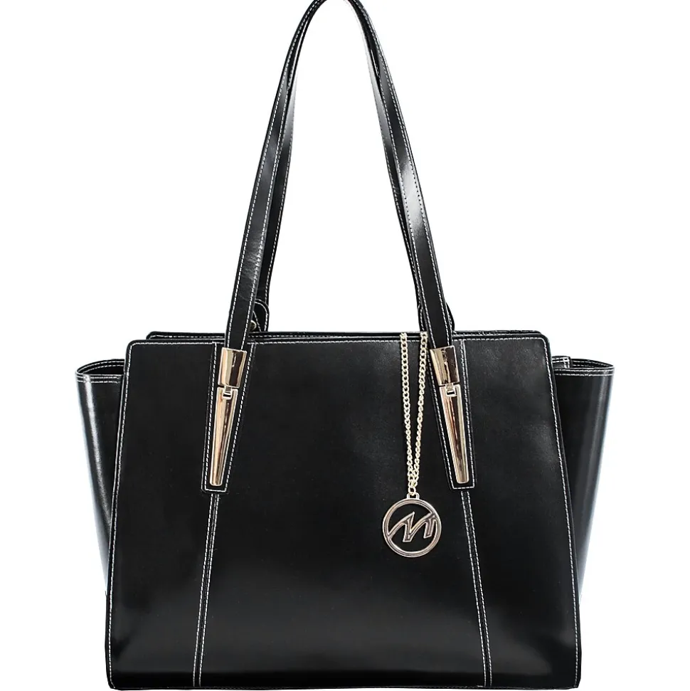 - Tote features elegant Gold Key Chain. Easy Access Exterior back pocket. One pocket perfect for tablets. Secure zipper pocket. Two Leather reinforced accessory slip pockets.