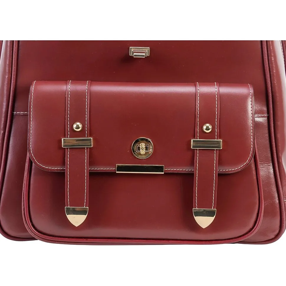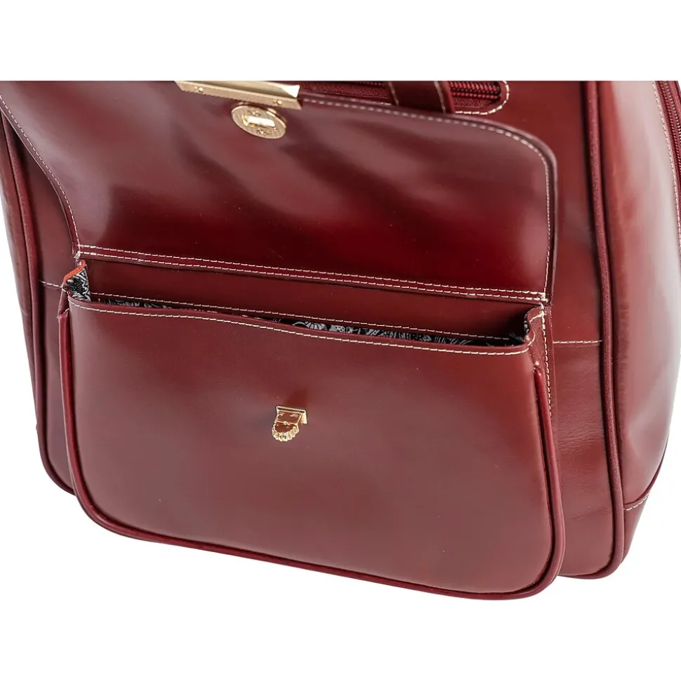 The McKlein MARYVILLE business laptop/tablet backpack features two front pockets (a zippered one and one with flap-and-belt design and clasp turn closure) and one main zippered compartment with flap and turn clasp closure. The main compartment has a wide opening, unzipping all the way down on each side, and includes a laptop/tablet pocket, a zippered pocket, and four slip pockets for power cords, plugs, and accessories. Zippers to the main compartment can be locked. Other features include a fully lined interior, gold-tone hardware, adjustable straps, a back zipper pocket, a handle hook for carrying or hanging, and protective metal feet on the base.
