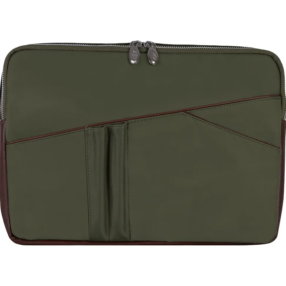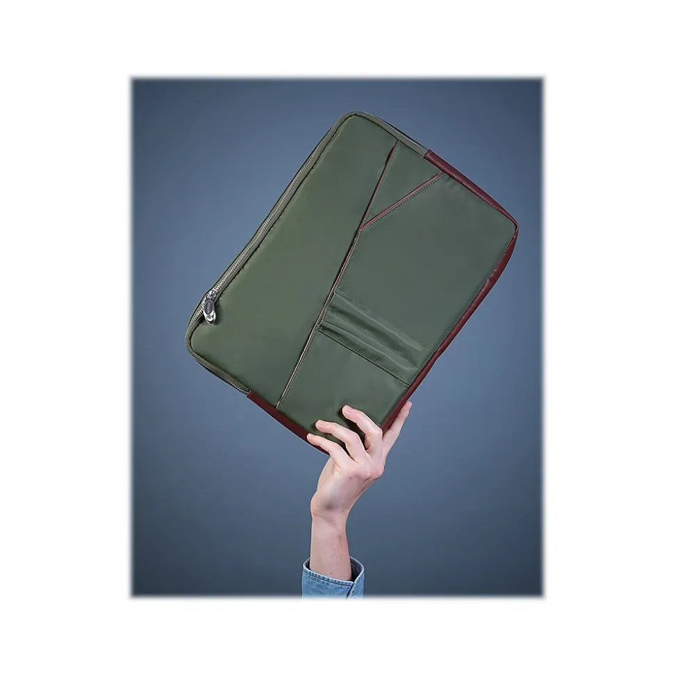 This padded nylon laptop sleeve with leather accents has a fully lined interior. It also features an easy-access front organizer for pens and accessories and a back full-length file pocket.