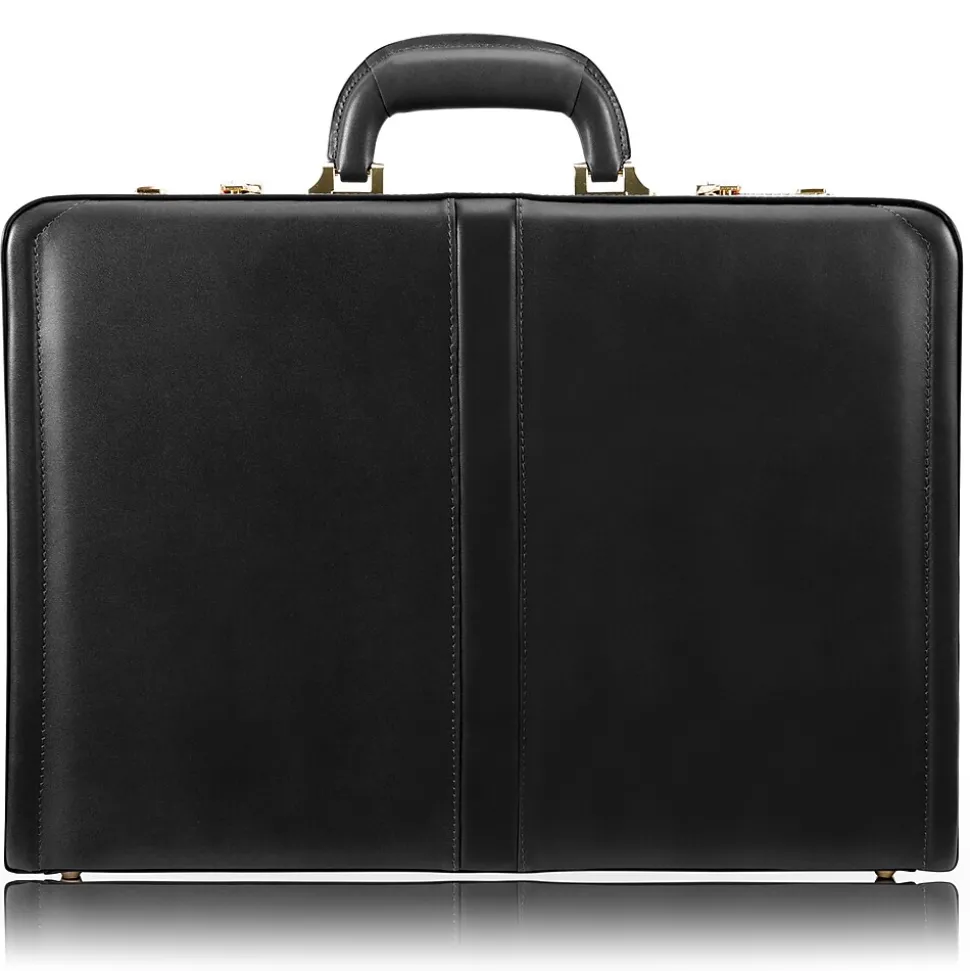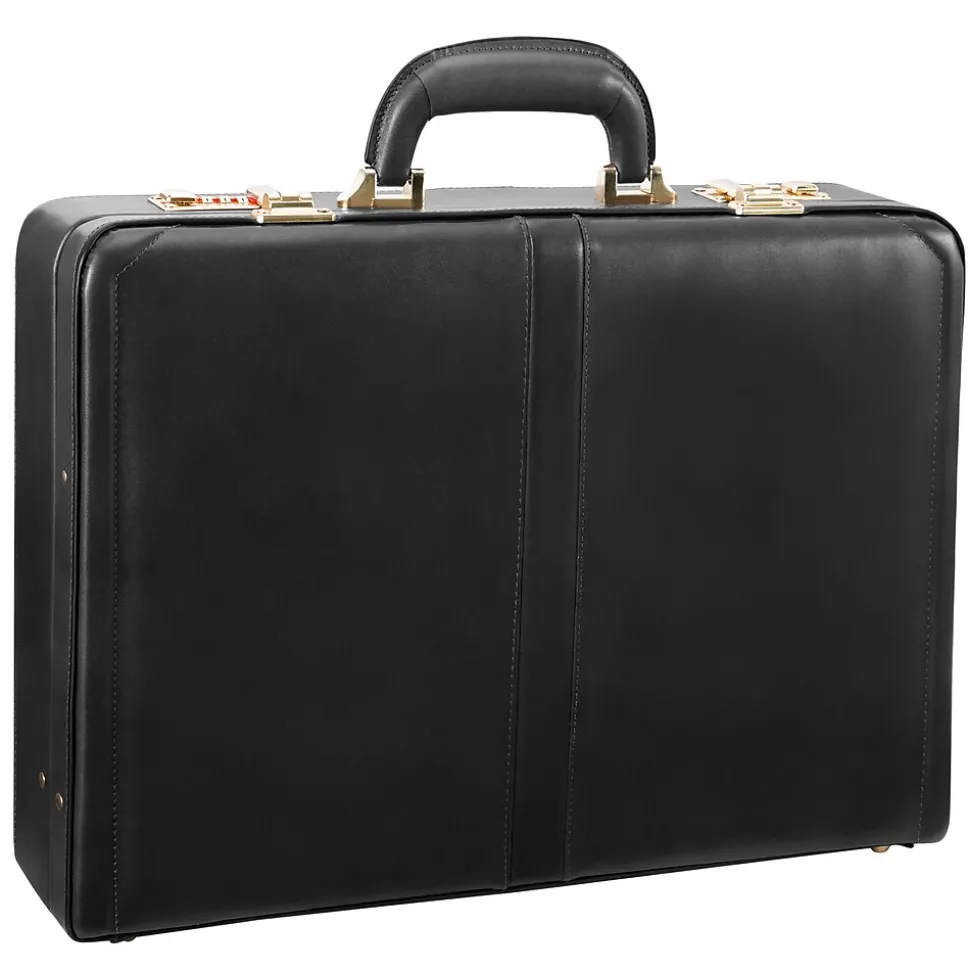 Slim design briefcase. 3-digit combination lock for added security. Gold-finished hardware. Comfortable top carry handle. Protective feet keeps case from falling over. Includes Tablet Pocket.