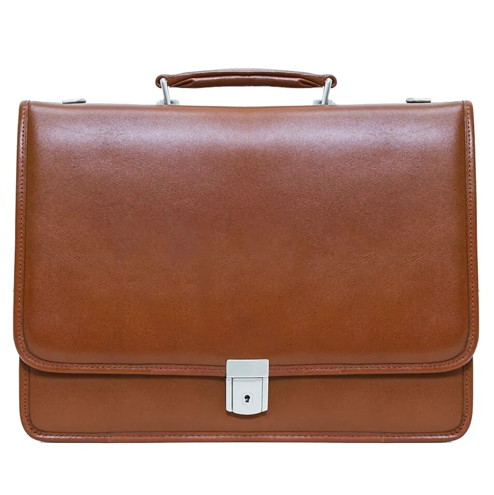 Briefcase with clean line design features secure key lock on front flap.