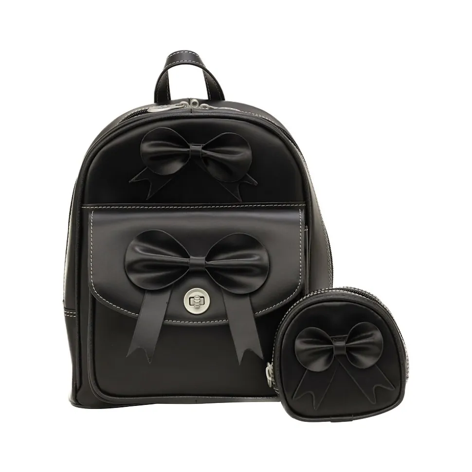 This McKleinUSA ACADIA mini bow backpack features two front pockets: one with twist lock and a slip one. The main compartment features a zipper pocket, two slip pockets, and a multipurpose pocket that can store a mini tablet. The zippers on the main compartment can be locked. The interior is fully lined, and there is also a hidden zipper pocket on the back. The backpack also features adjustable straps and a handle hook for carrying or hanging. Comes with a matching coin purse.