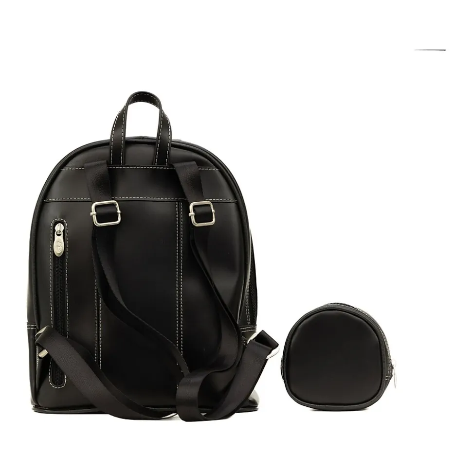 This McKleinUSA ARCHES mini backpack features a front zipper pocket. The main compartment features a zipper pocket, two slip pockets, and a multipurpose pocket that can store a mini tablet. Zippers to the main compartment can be locked. The backpack features a fully lined interior, and there is also a hidden zipper pocket on the back. It also features adjustable straps and a handle hook for carrying or hanging. Comes with a matching coin purse.