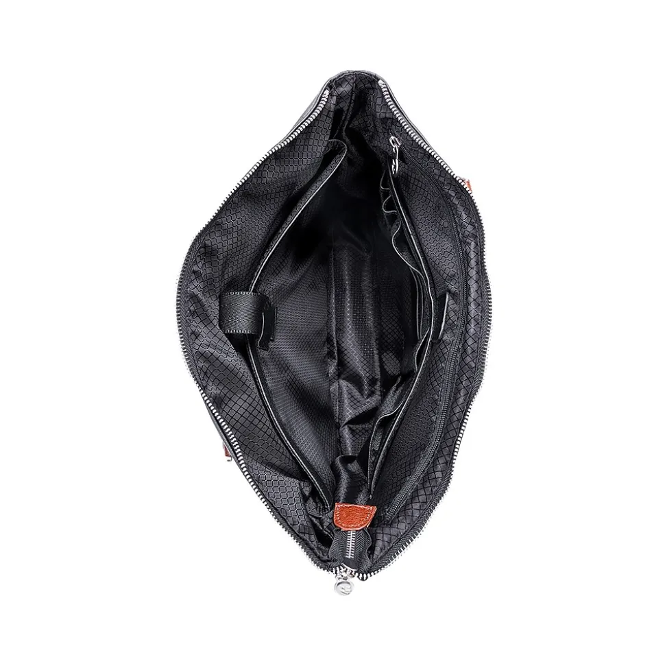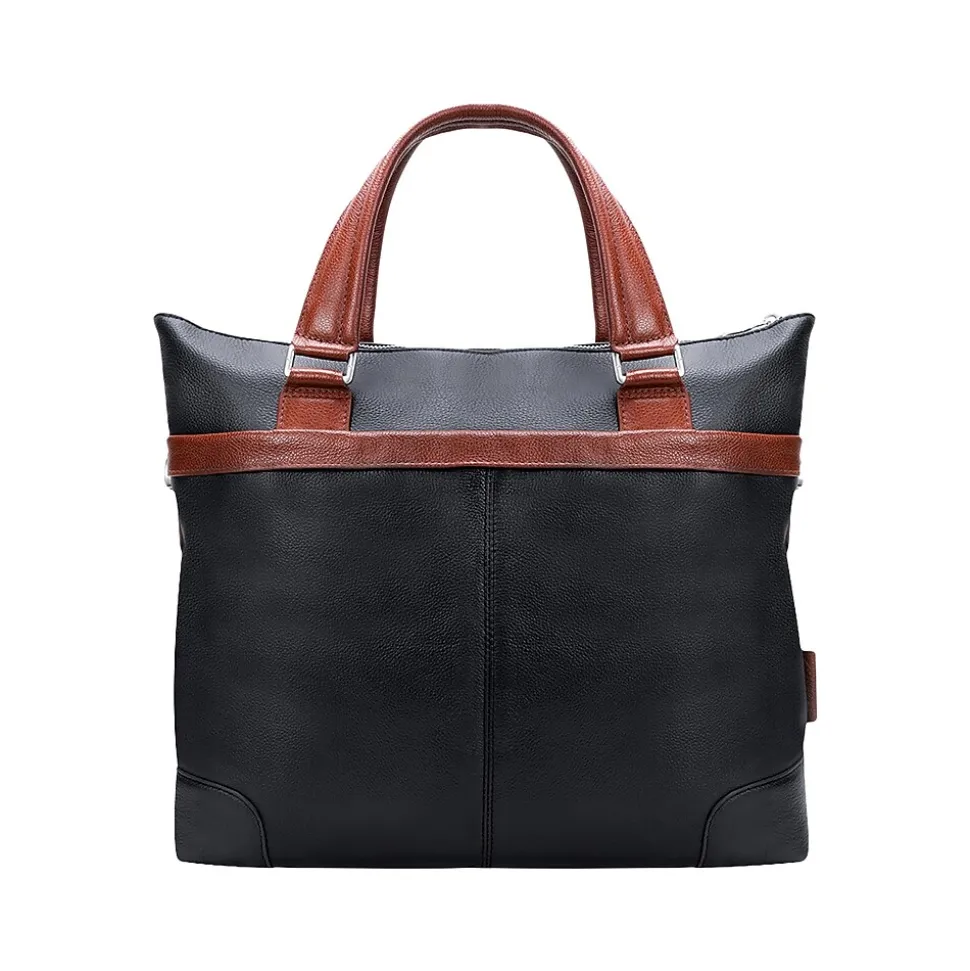 Carry all your important devices in this McKleinUSA EASTWARD U Series 15″W leather laptop and tablet briefcase designed with elegant contrasting leather accents. Conveniently access your essential items safely in its hidden full-length front zipper pocket. Its fully lined interior is accented with leather trim and silver hardware securing your items with lockable zipper. Well-designed full-length interior zipper pocket and business accessory organizer help make your day go smoothly. Exterior back zipper pocket for easy access to your most needed items (cellphones, keys, and more). Transport in comfort with the non-slip contour-padded removable shoulder strap, and set it down with confidence on five protective metal feet.