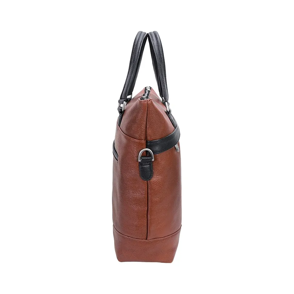 Carry all your important devices in this McKleinUSA EASTWARD U Series leather laptop and tablet briefcase designed with elegant contrasting leather accents. Conveniently access your essential items safely in its hidden full-length front zipper pocket. Its fully lined interior is accented with leather trim and silver hardware securing your items with lockable zipper. Well-designed full-length interior zipper pocket and business accessory organizer help make your day go smoothly. Exterior back zipper pocket for easy access to your most needed items (cellphones, keys, and more). Transport in comfort with the removable non-slip contour-padded shoulder strap, and set it down with confidence on five protective metal feet.
