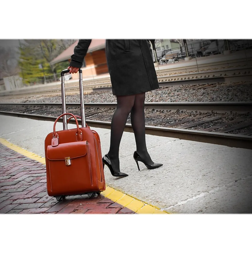 The UPTOWN by McKleinUSA is a wheeled ladies’ laptop briefcase made of leather. Its vertical design allows you to easily roll the case in tight spaces like airport aisles, trains, and buses. The quick-access front pocket secured by a flap features a key lock. The interior organizer has storage space for media devices, business cards, key holder and pens. The built-in high-density laptop compartment protects laptops up to 15″ in size. The smart attachment strap allows transport on extended handles of other rolling cases and luggage.