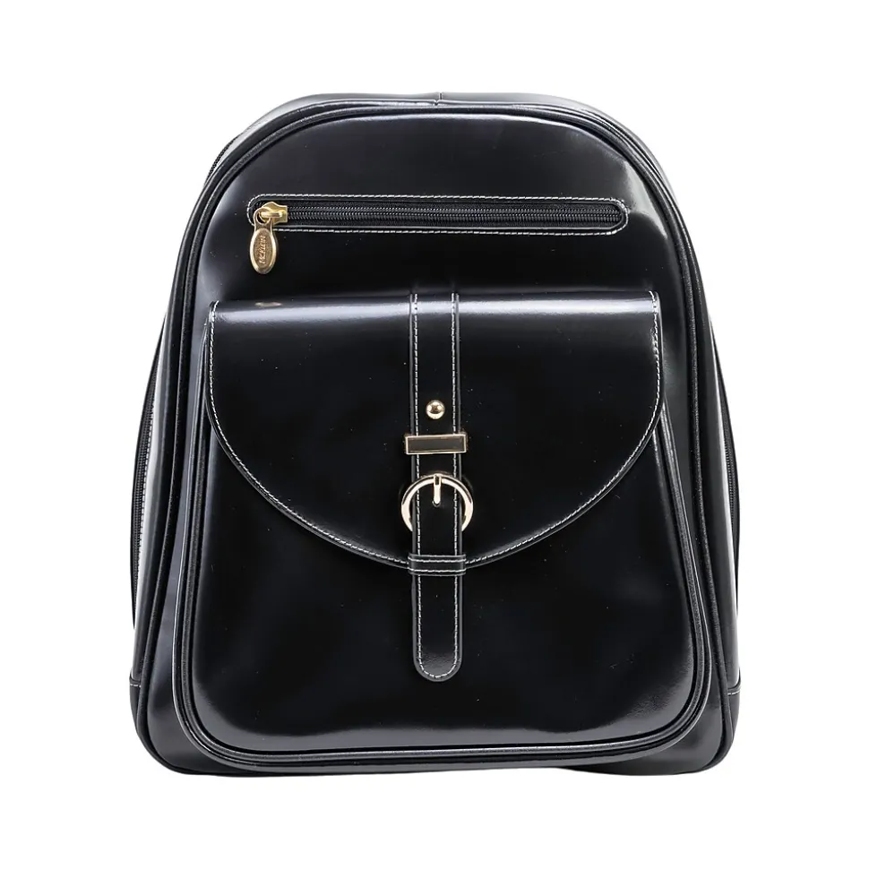 This McKleinUSA MOLINE business laptop/tablet backpack features a front pocket with a magnetic clasp and a belt design on the front pocket, interior laptop pocket and tablet pocket, back zipper pocket, four slip pockets for power cords, plugs, and accessories. The main compartment features a wide opening, with the ability to unzip all the way down on each side. The zippers on the main compartment can be locked. The interior is fully lined, complete with hardware in a gold-tone finish. The backpack also features adjustable straps and a handle hook for carrying or hanging. Comes with protective metal feet on the base.