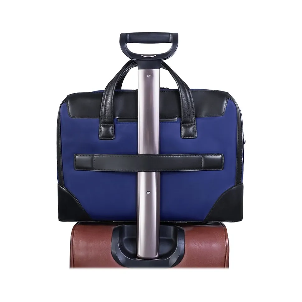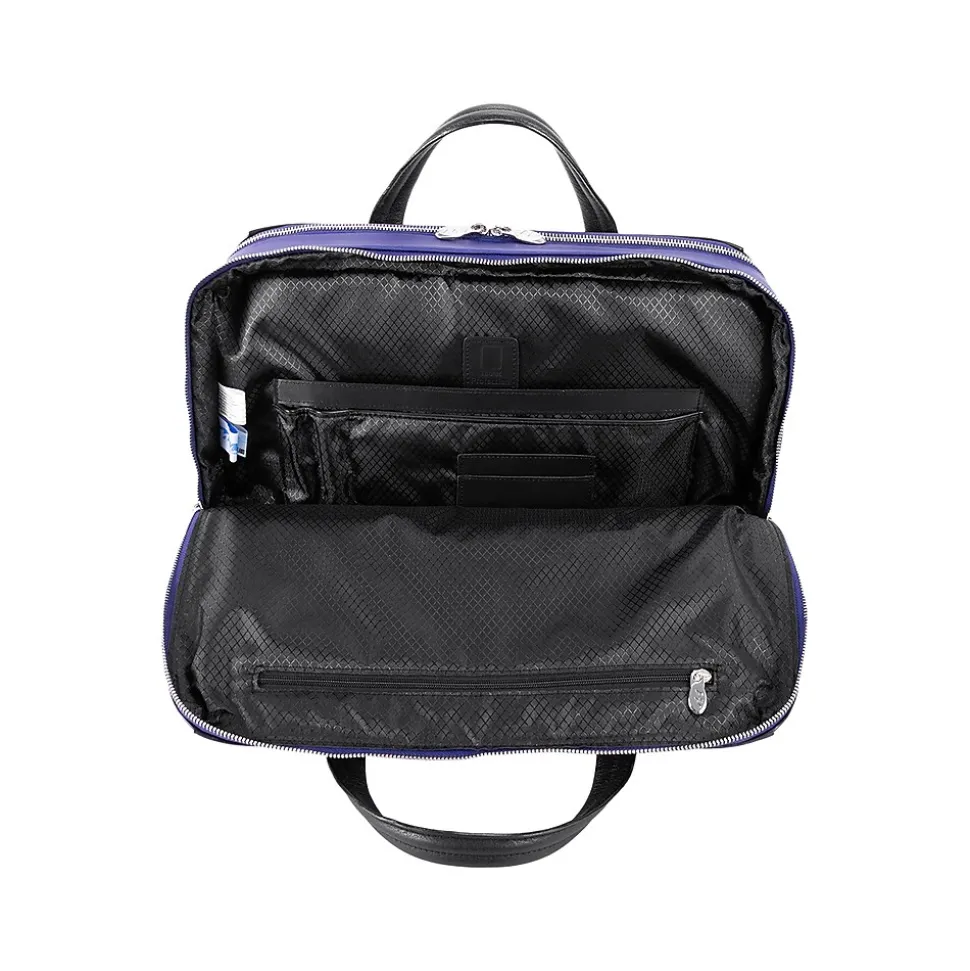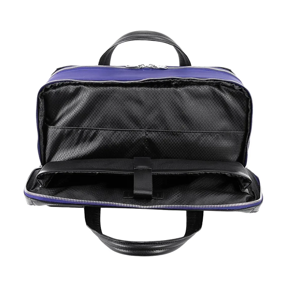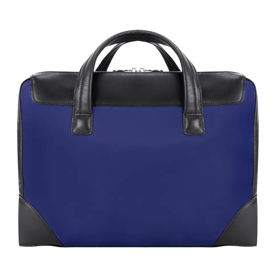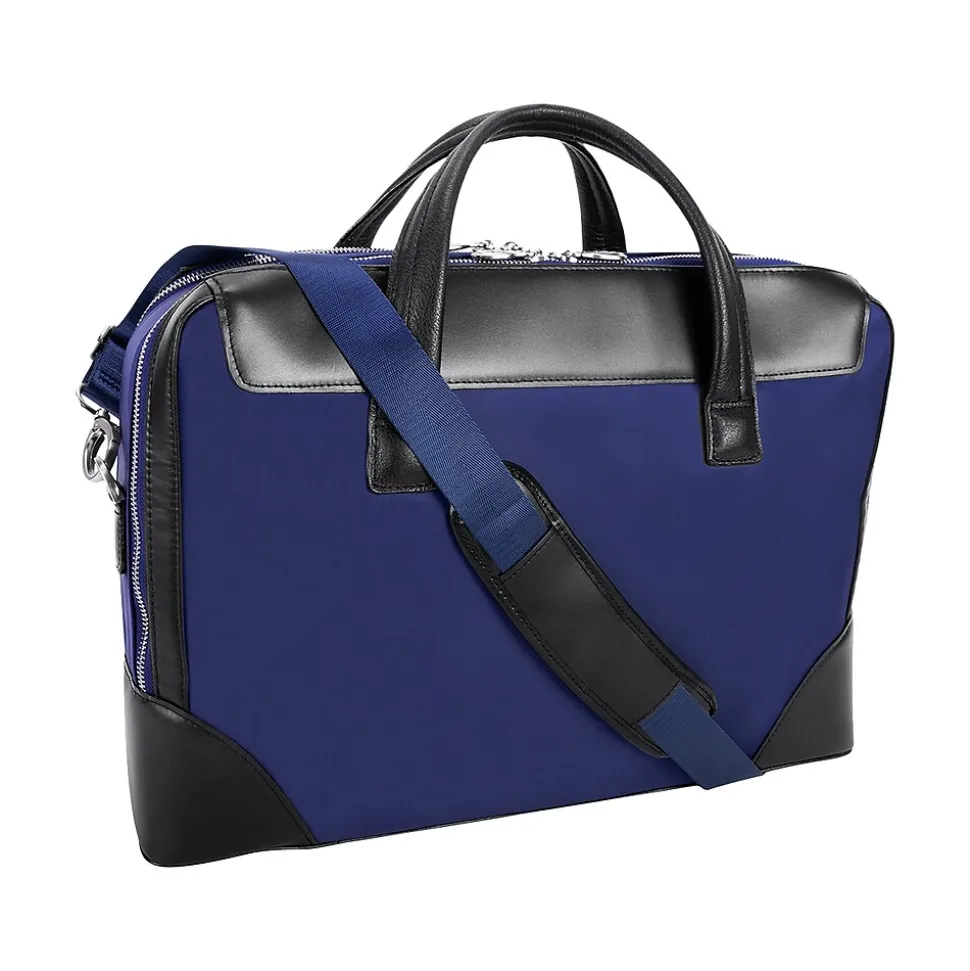 This structured nylon briefcase with a leather handle has a fully lined interior with leather accents. Its front compartment features dual tablet pockets with an organizer for business cards, pens, and accessories. The spacious back compartment features a padded laptop compartment.