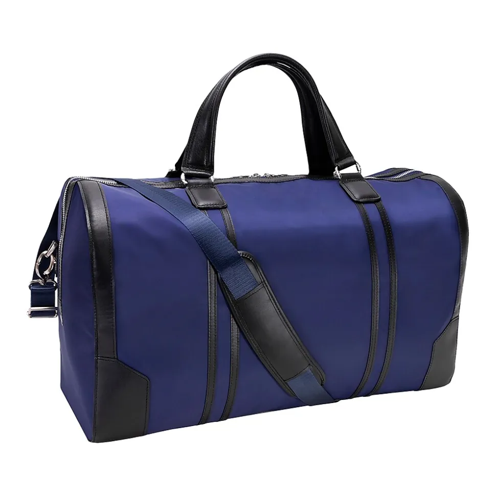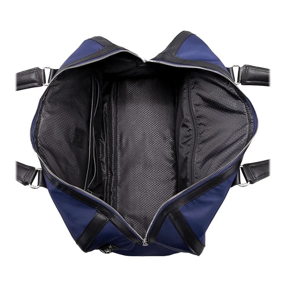 This spacious nylon duffel bag with leather accents has a fully lined interior. It also features an interior tablet pocket with an organizer for business cards, pens, and accessories and an easy-access secure back zipper pocket.