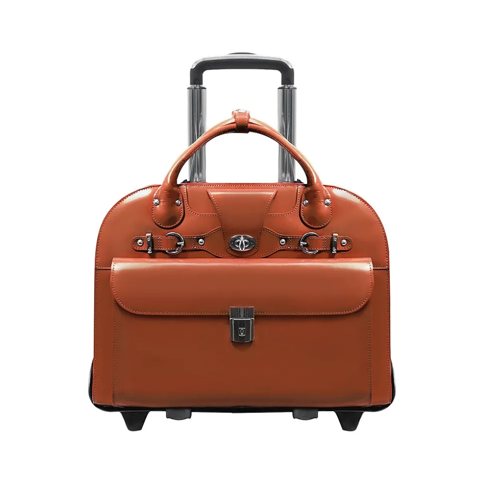 The ROSEVILLE W Series by McKleinUSA is leather wheeled ladies laptop briefcase that has patented 2-in-1 removable wheel and handle system. Fly-through checkpoint-friendly design with a secure, removable padded sleeve that fits laptops up to 15″. Flapover front pocket with a key lock for added security. Small front pocket secured by flap with turn lock. Main compartment divided by a secure zipper pocket. Interior organizer section for business cards, pens, keys, cell phones, and notepads. Interior zipper pocket.