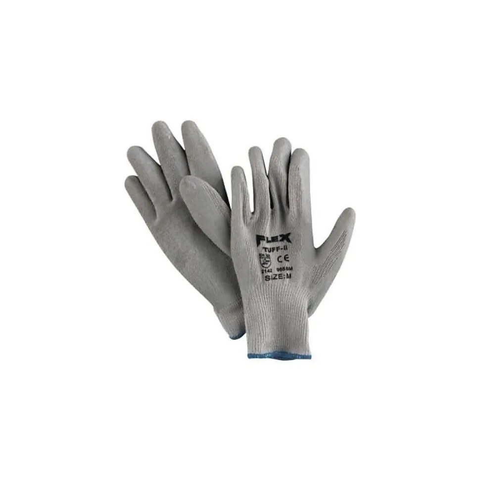 Memphis GlovesĀ® Flex-Tuff IIĀ® Medium coated gloves in grey color feature cotton/polyester coating for enhanced durability and safety. Natural rubber gloves with knit wrist cuff are ideal for industrial or warehouse works.