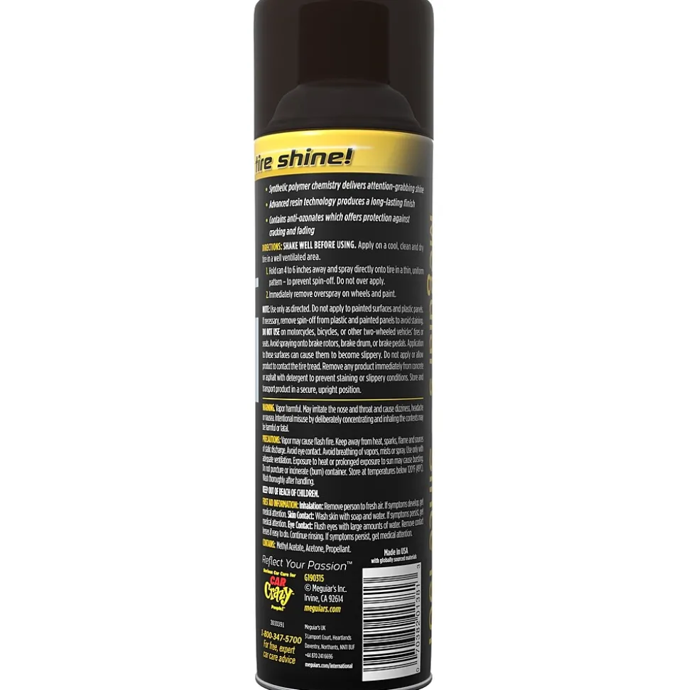 Meguiar’s Ultimate Insane Shine Tire Coating is the highest gloss tire shine Meguiar’s has to offer. With advanced synthetic polymer chemistry this premium aerosol tire shine delivers extreme, attention-grabbing depth with amazing shine and gloss. You won’t believe your eyes as tires will appear like they are actually wet! Our exclusive formula also contains enhanced resin technology producing an amazing bond for a long-lasting finish. Anti-ozonants protect tires against cracking and fading over time while the self-spreading formula is easy to work with reducing streaks and runs. So, if you are looking for a tire coating that offers protection, is easy to use and with a shine that looks like it’s soaking wet, Meguiar’s Ultimate Insane Shine Tire Coating is for you.