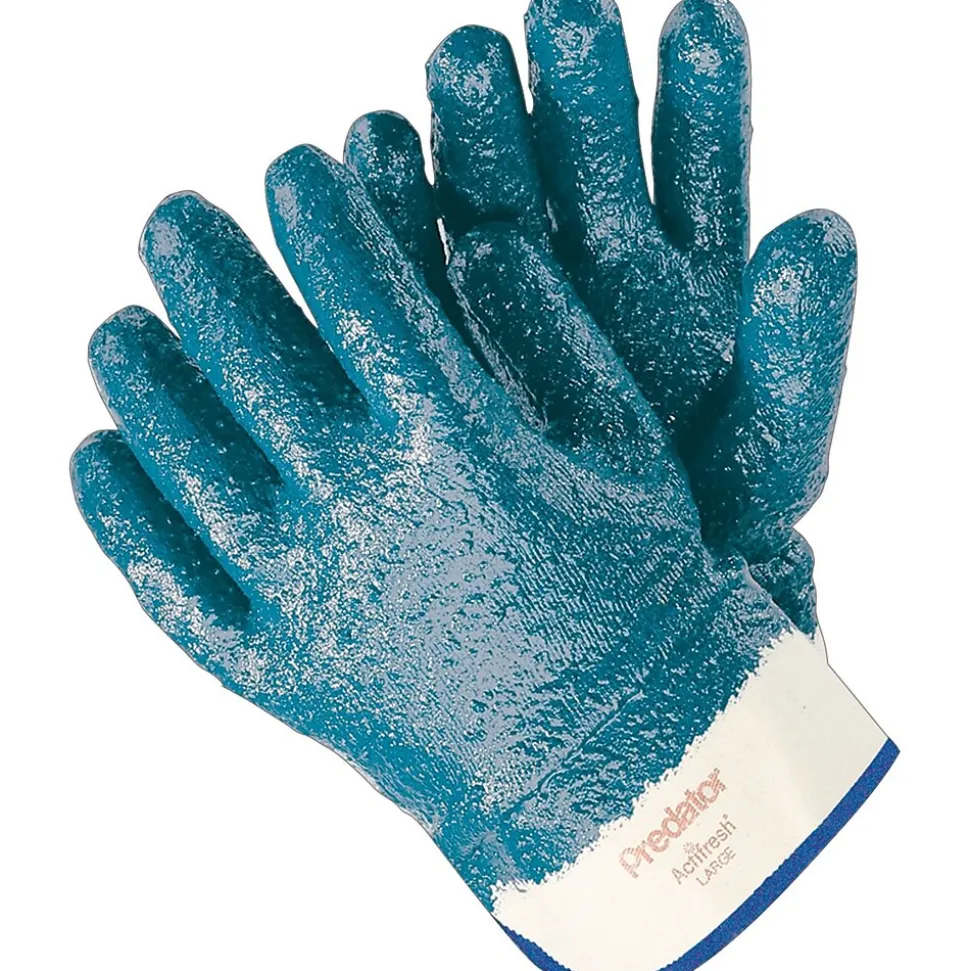 Memphis Gloves Predator Large coated gloves in blue color with nitrile coating are made of cotton jersey lining for comfort. Cut or abrasion resistant gloves with safety cuff are ideal for industrial or warehouse works.