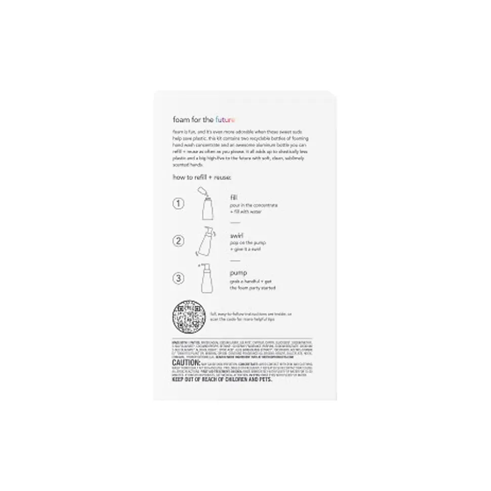 This Method Refill + Reuse concentrated foaming hand soap refill smells like a clean, watery blend of bergamot, lemon, rosemary, and crisp marine notes. This kit contains two recyclable bottles of foaming hand wash concentrate and an awesome aluminum bottle you can refill and reuse as often as you please. It all adds up to drastically less plastic and a big high-five to the future with soft, clean, sublimely scented hands.