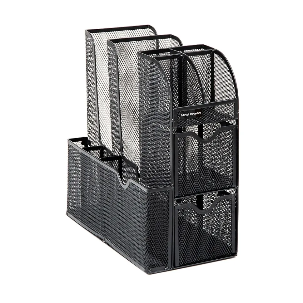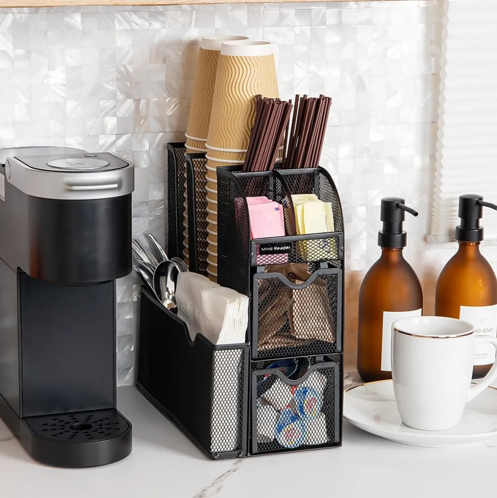 Tidy up your space with this all-in-one organizer. Boasting eleven compartments, it’s perfect for neatly storing coffee, tea, condiments, and more. The high versatility makes it an excellent choice for college dorms, office breakrooms, hotel lobbies, and even bathrooms for organizing makeup and toiletries.The 11-compartment organizer comes with three tiers and two drawers, creating an easy-to-use storage system for all your small items. Its 3.75-inch (9.5 cm) opening can comfortably stack 12-, 16-, and 20-oz cups and lids. Further compartments cater to utensils and napkins, single-serve coffee pods, creamers, tea bags, salt and pepper packets, and even snack bars and chocolates.With no assembly required, the organizer is ready to use right out of the box. Place it in your kitchen, office, or cabinets to neatly store and organize small items. It’s simple black color and modern design blend seamlessly with any decor, making it a stylish addition to any space.Constructed with durable, metal mesh, this organizer is built to withstand high-traffic areas and frequent use.Perfect for those who appreciate a neat and organized space, this 11-compartment organizer makes an excellent gift. Bring order to your spaces with this versatile, all-in-one organizer.