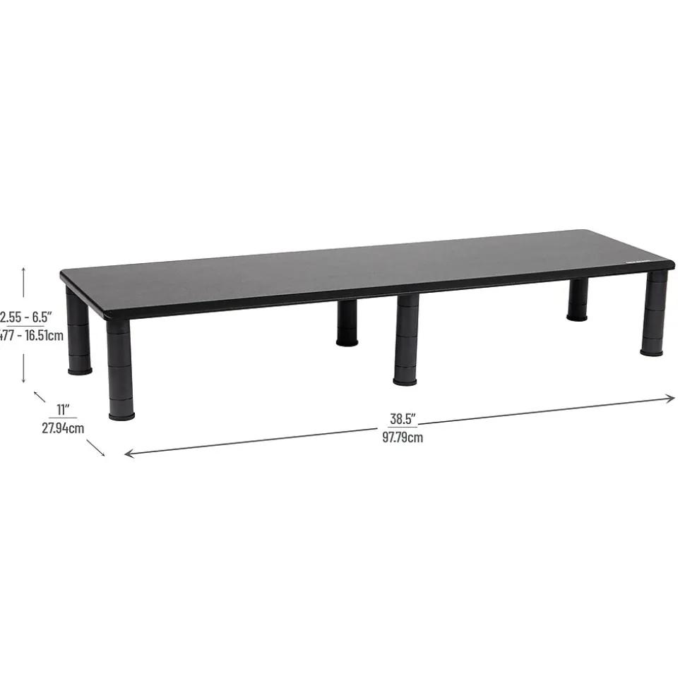 - Dimensions: The dimensions of this dual monitor stand are 38.5 long x 11 wide x 2.55-6.5 inches tall (97.79 x 27.94 x 6.48-16.51 cm) and is adjustable