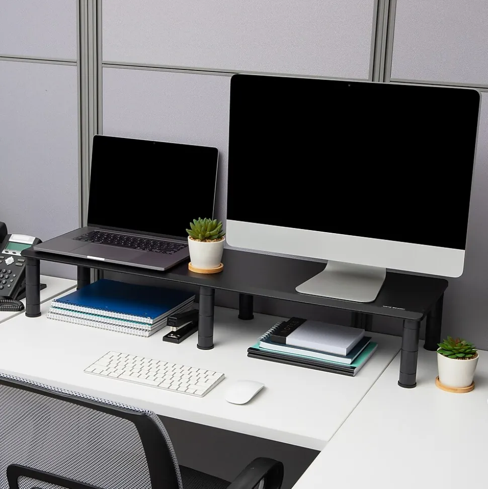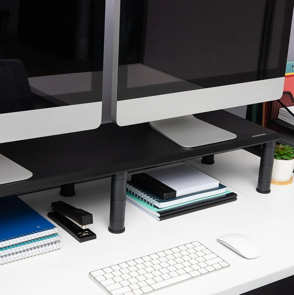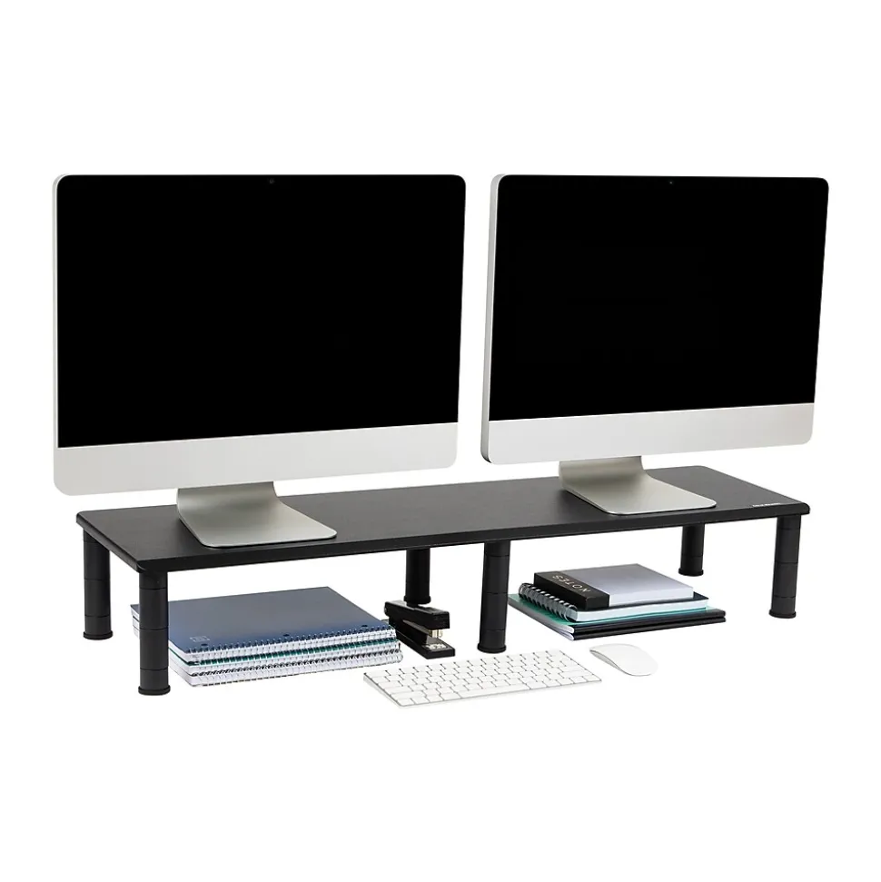 Enhance productivity and ergonomics with our dual monitor stand, a perfect solution for multi-screen users seeking an organized workspace. Utilize one side for electronics like laptops or printers, freeing up valuable desk space. Tailor the stand to your needs with four adjustable height settings for optimal comfort.Beneath the stand, stash office essentials like pens and notepads, maintaining a tidy workspace. Anti-slip rubber grips secure the stand and safeguard your desk from scratches. Holding up to 40 lbs. (18.1 kg), it’s durable and easy to clean with mild soap and water. Lightweight and portable, it’s suitable for home or office use, doubling as a shelf for TVs or home theater systems.Part of the Anchor Collection, our dual monitor stand combines style and functionality, making it an ideal gift for various occasions. Whether for a new office setup or a home office transformation, this stand promises to enhance any workspace.