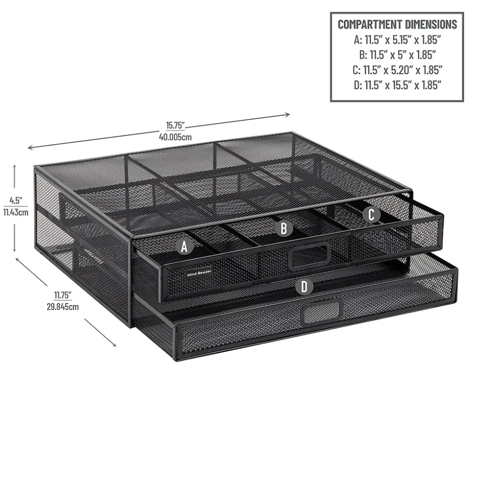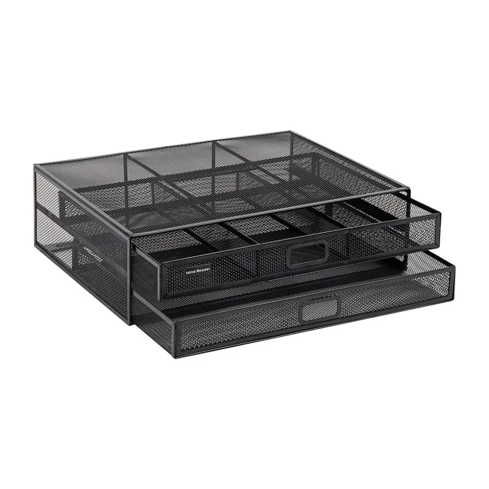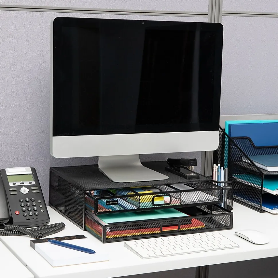 Enhance your workspace with our two-tier desktop organizer and monitor stand. Capable of holding up to 40 lbs. (18.1 kg), it’s perfect for securely supporting desktop electronics such as laptops, notebooks, monitors, printers, and can even double as a TV stand.The organizer features a durable metal mesh construction, which ensures that it withstands daily use. Non-slip grips on the bottom of the stand keep it firmly in place, ensuring your items stay secure and stable. Weighing in at just 4.4 lbs. (2 kg), it’s also extremely portable and can easily be moved to wherever you need it.Maximize your organization capabilities with two tiers of drawers. The top tier is ideal for storing files, folders, and other important documents, while one of the pull-out drawers features three separate compartments for storing office essentials like pens, pencils, and paper clips. The see-through design lets you quickly locate what you need.This desktop organizer is a great addition to your office setup and blends in perfectly with the rest of the Network Collection. It also makes an excellent gift for graduations, birthdays, holidays, and other special occasions. Boost your productivity and keep your space tidy with this versatile desktop organizer.