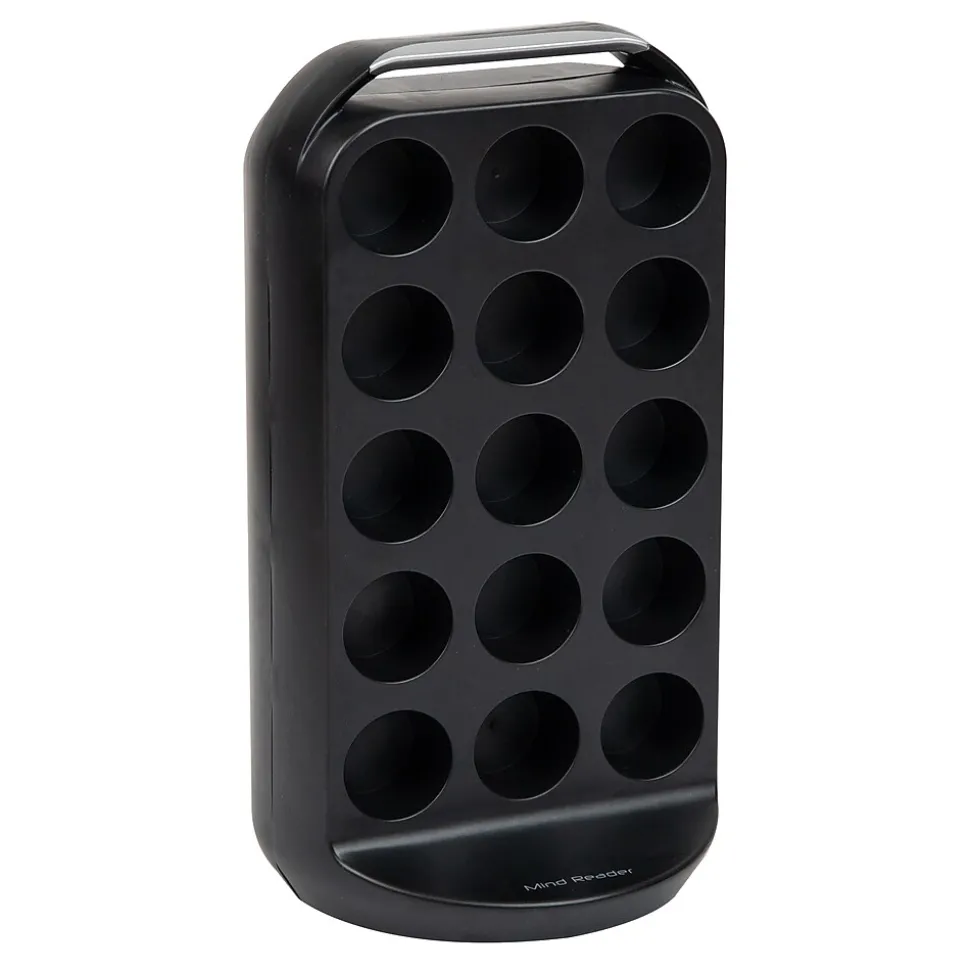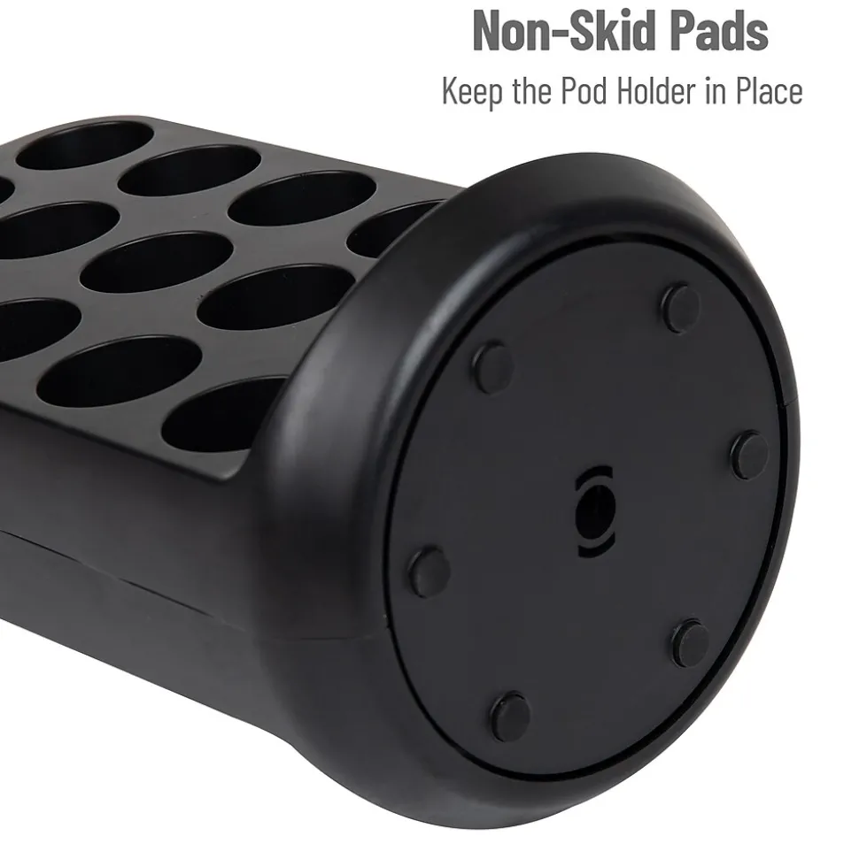 Simplify your mornings and enjoy a seamless coffee routine with this single-serve coffee pod carousel. The swivel organizer, equipped with a lower base finger grip, allows effortless browsing through 30 coffee choices with a simple wrist movement.Featuring a patent-pending locking system, this countertop coffee pod storage ensures secure pod placement at any angle. Compatible with 1.5-inch (3.81 cm) base and 2-inch (5.08 cm) top single-serve pods, inserting and retrieving coffee pods becomes exceptionally convenient.Crafted from lightweight, durable black plastic, the carousel is easily cleaned with a damp cloth, ensuring a smooth swivel base. Rubber grips beneath provide stability and prevent slipping on countertops.Transporting is easy with the built-in handle, and its compact design takes minimal countertop space, making it an excellent kitchen or office addition.Gift this coffee pod carousel to early risers, teachers, grandparents, or anyone valuing a swift and organized coffee experience. Elevate their mornings with this considerate and practical organizer.