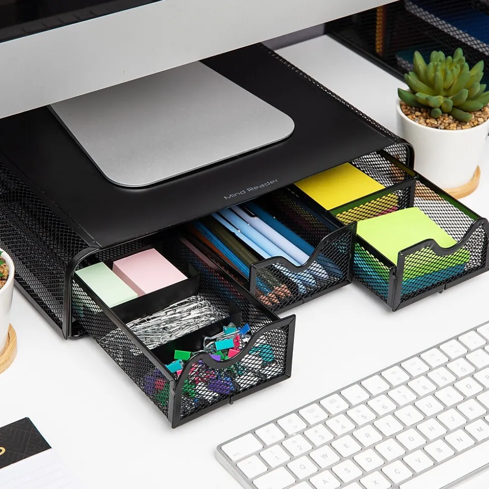 Experience the benefits of an ergonomic monitor stand designed to improve posture, reduce neck and shoulder pain, and elevate your monitor to a comfortable eye level for optimal viewing. This monitor stand not only helps reduce muscle and neck strain but also frees up valuable desk space for increased productivity.Featuring rubber feet for stability and an attractive design, this stand includes a built-in desk organizer with three drawers, offering ample storage for office supplies. Made from high-quality metal mesh, it is strong, durable, and easy to clean for daily use.Measuring 13.25 x 12.5 x 3 inches and weighing 5.5 lbs, this monitor stand can hold a variety of monitor sizes and weights up to 22 lbs. Easily movable and versatile, it makes a great gift for students, those with small spaces, or people who enjoy traveling. Complete your workspace with other Network Collection products for a cohesive, organized look.