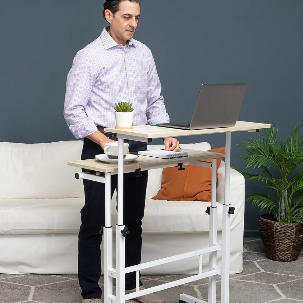 This versatile workstation adapts to your workday and lifestyle. This innovative two-tiered desk offers the flexibility to sit or stand while working and provides ample space for other items. The adjustable desktop allows you to work at the perfect height, making it ideal for a variety of tasks.Despite its sturdy construction, this mobile desk is easy to move, thanks to the four lockable casters. With dimensions of 38 inches long, 21.25 inches wide, and an adjustable height from 27.5 to 45.25 inches, this desk is perfect for any work or study space.Made of durable MDF and metal, the Woodland Collection Mobile Sit/Stand Desk is built to withstand daily use and is easy to clean with a soft cloth and mild soap. A thoughtful gift for college students or remote workers, this flexible workstation is the perfect addition to any home or office.Embrace a dynamic work lifestyle with the Woodland Collection Mobile Sit/Stand Desk – your one-stop solution for a comfortable and efficient workspace.