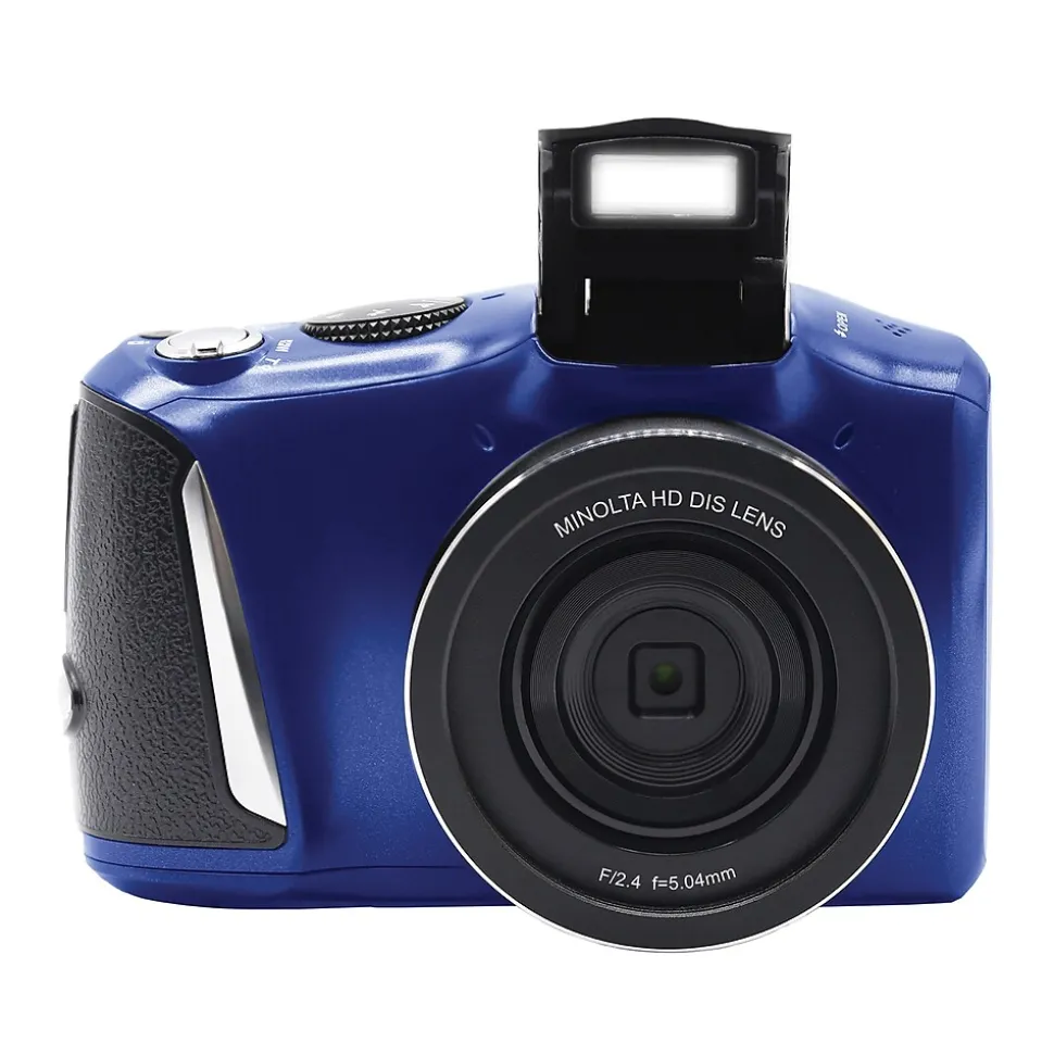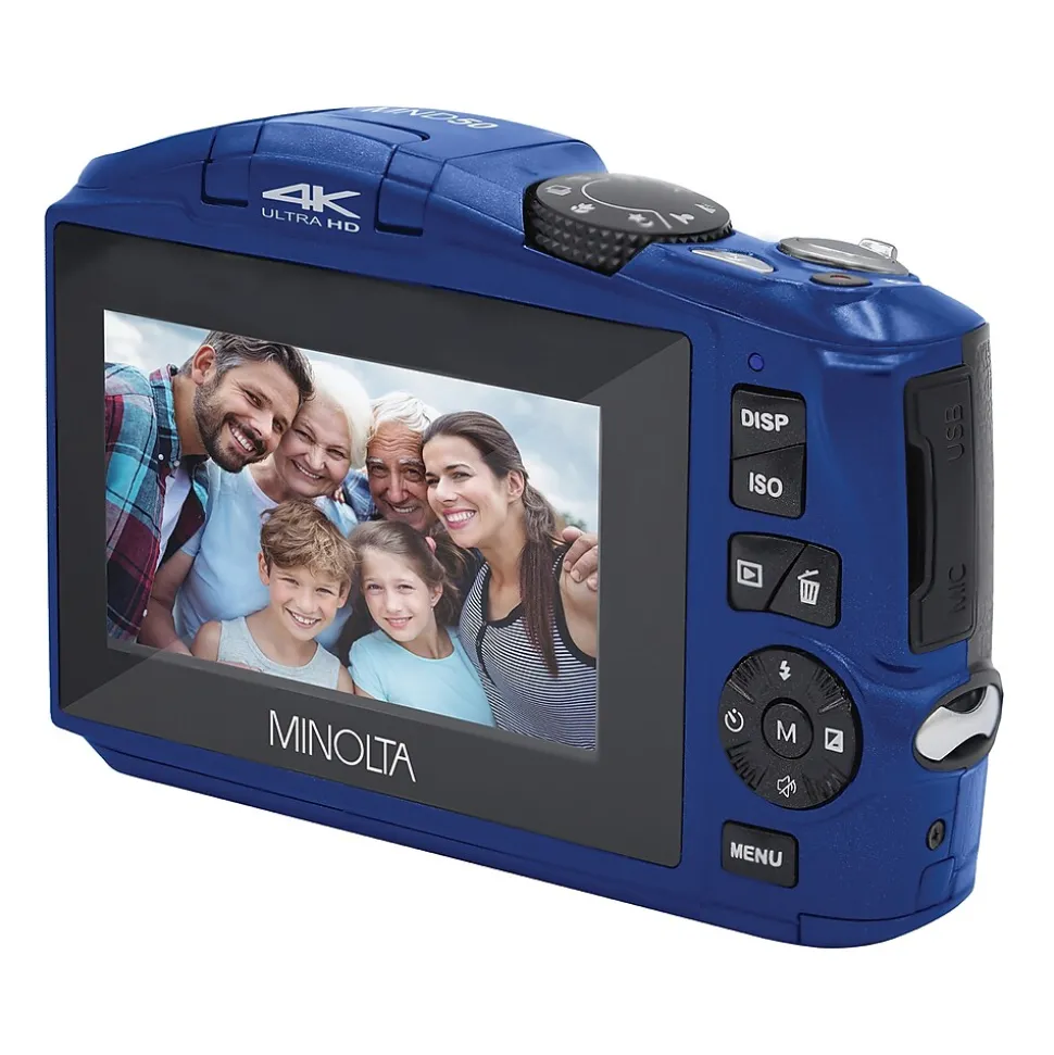 The Blue MND50 from Minolta is a robust digital camera with high-end features packed into a point-and-shoot package. Capture 48 MP photos and 4K Ultra HD video with ease using the 16x digital zoom lens and 3-in. IPS LCD monitor. Rotate the mode dial to enable the ideal settings for any scene and shoot closeups in vivid detail and clear focus using the macro mode with ISO 6400.
