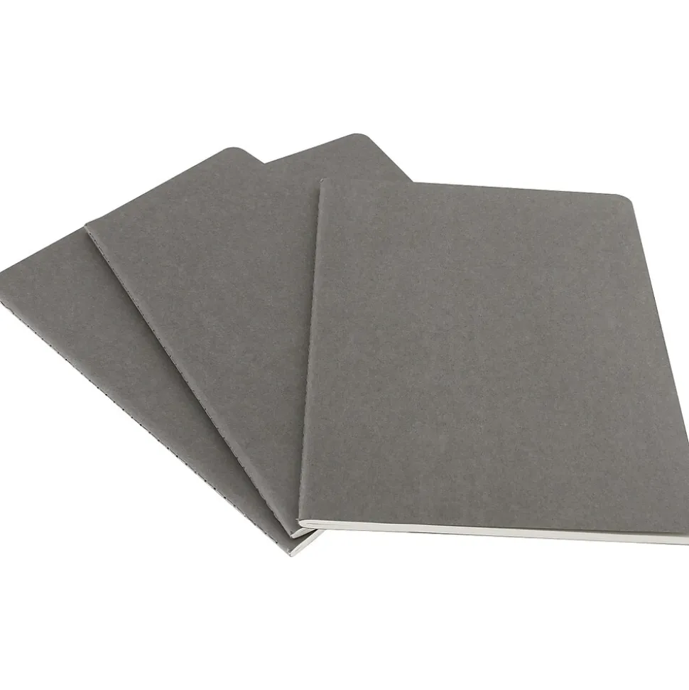 The Moleskine Cahiers are journals with a flexible heavy-duty cardboard cover in pebble grey with visible stitching on the spine. The last 16 sheets are detachable and there is a pocket for loose notes. Each set of 3 pieces includes the Moleskine history. With acid free paper and ruled pages. Set of 3.