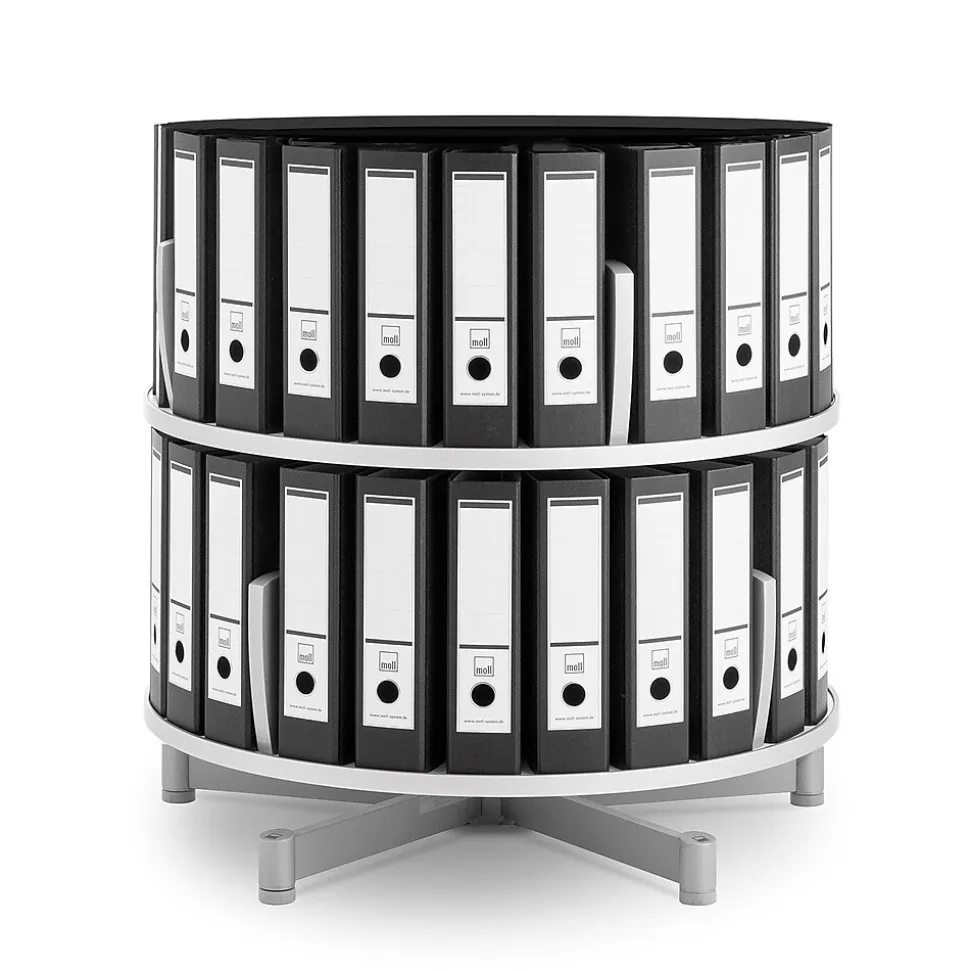 MollĀ® Two-tier binder and file storage carousel features 32″ diameter unit which offers abundant storage in a small area. Carousel shelf is protected with a hard rubber edge banding. Also seen in picture Top storage carousel (Item 277944) and Caster base (Item 277729) sold separately