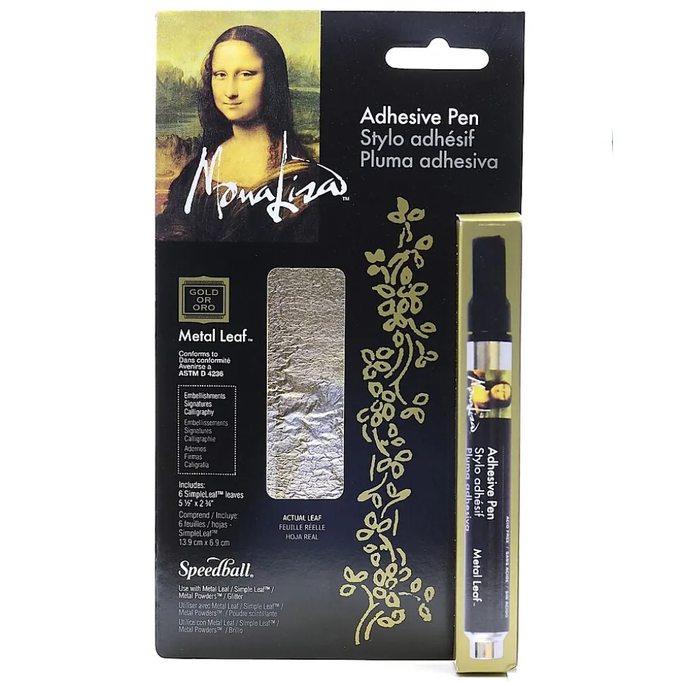 The Mona Lisa Adhesive Pen makes it easy to apply metal leafing. Use it like a pen to write or draw designs on a variety of surfaces. After 5-10 min., press metal leaf onto the project and then gently remove the excess leaf. The pen has dual tips; just p pull the bullet tip out of the pen, flip, and it becomes a chisel tip. The two tips make the pen perfect for creating embellishments, fine detail, signatures, calligraphy, lace design, ornaments, and more. The pen-s adhesive is both non toxic and acid f ree. The Mona Lisa Adhesive Pen comes with six sheets (5 1/2 in. x 2 1/2 in.) of either gold or silver Simple Leaf , a micro-thin metal leaf.