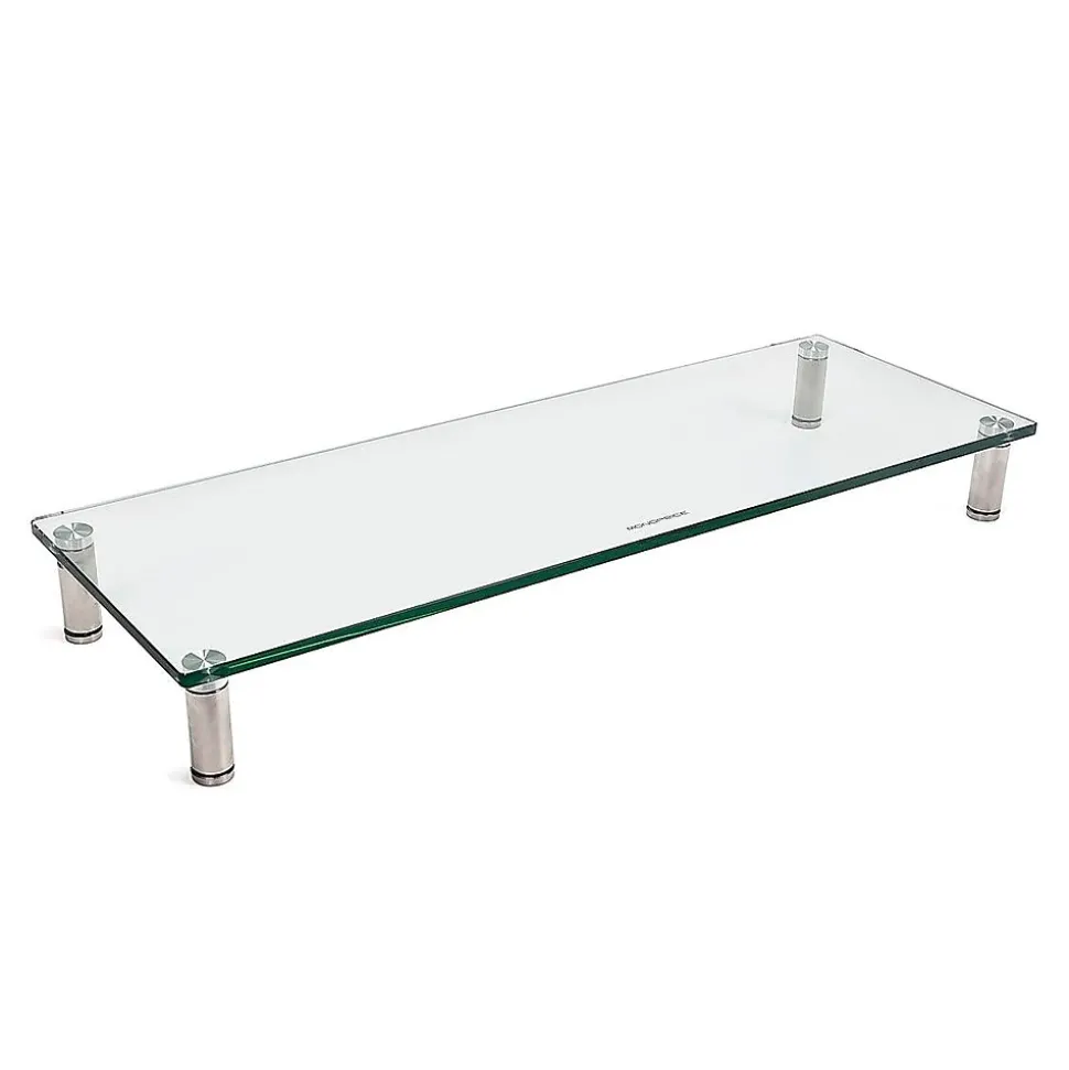 Reduce desk clutter and work more comfortably with this Monoprice multimedia desktop monitor stand. The sturdy plate glass construction supports up to 66 pounds and provides a flat, raised shelf ideal for desktop displays, laptops, and speakers. The four 1-inch diameter aluminum legs elevate the shelf 3.1 inches off your desk and feature adjustable feet that offer up to one additional inch in height for short desks and uneven surfaces. The sleek, clean look of this Monoprice multimedia desktop monitor stand enhances the look of your desk while raising displays for more comfortable working angles.