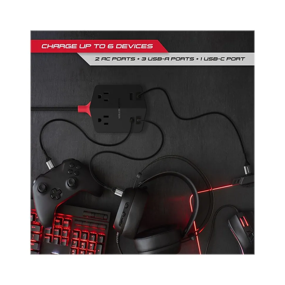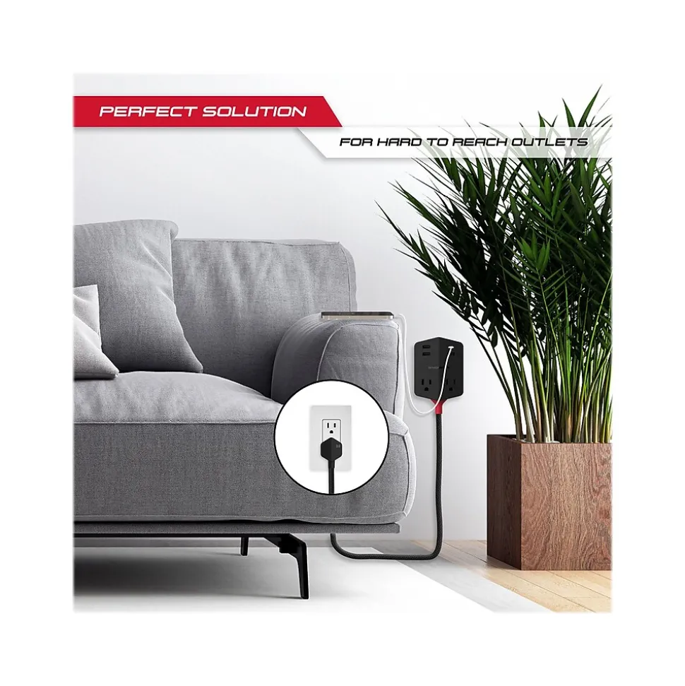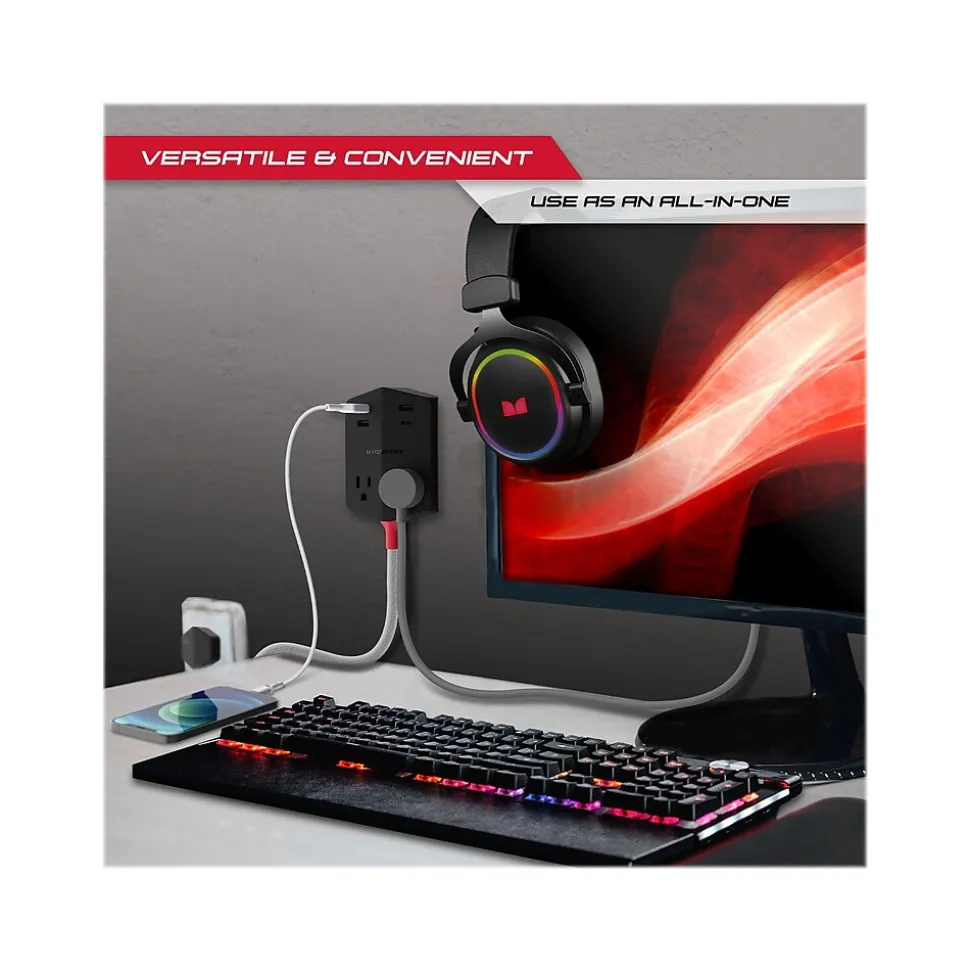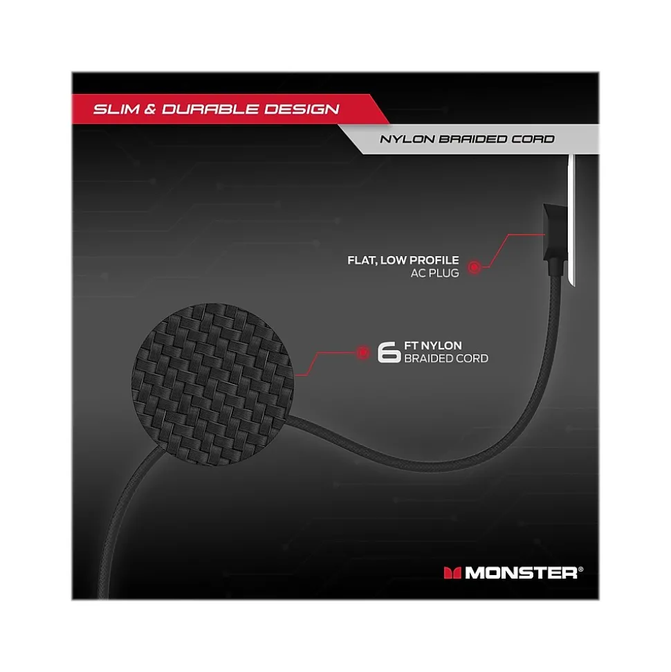 The Monster indoor power strip with a nylon cord features two AC outlets, three USB Type-A ports and one USB-C port to meet all your power needs. The flat, low-profile AC plug is great for hard-to-reach outlets.