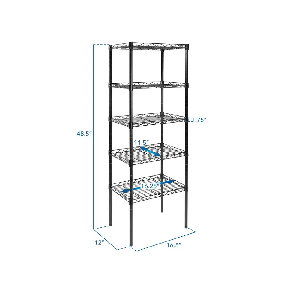 The Mount-It! five-tier metal shelving unit is the perfect metal storage rack for offices, kitchens, garages, laundry rooms, bathrooms, and bedrooms. With spacious shelves and a carrying capacity of 88 lbs. per shelf, this five-tier metal shelving unit can hold a plethora of items like office supplies, food, toiletries, and boxes. If you have larger items that are tall you can easily rearrange and adjust the shelf height in order to fit your larger items. There is no better solution to simple storage than Mount-It! storage shelves with adjustable feet.