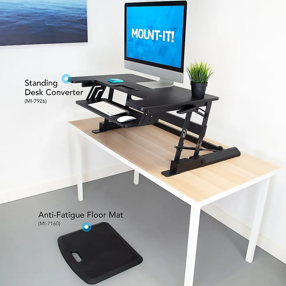 This bundle includes a height adjustable manual sit stand desk converter large enough for two monitors and a soft anti-fatigue mat for more comfort and less pain while standing at work. The Active Essentials Plus ergonomic bundle can easily and quickly turn any existing workspace into a healthier, more active workstation and is perfect for those looking to create a more comfortable and ergonomic work environment. Maintain a healthy balance of sitting and standing throughout the day to increase productivity, boost energy and improve your workflow. Start on the path to a healthier way to work with this ergonomic workstation bundle.The manual height adjustable standing desk converter features a wide 36” tabletop and can adjust from 6.25” to 16.5” high, allowing you to create a customized setup throughout the day.Our anti-fatigue mat is a necessity with any standing desk. The soft cushy floor mat allows you to stand longer at your standing desk without the pain associated with prolonged periods of standing.