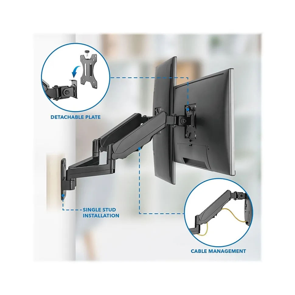 Easily raise your monitor to an optimal viewing height, reducing the strain on your neck and shoulder while working with Mount-It! MI-1766B dual-monitor wall mount. Each arm comes with a gas-spring mechanism for easy height adjustment without the need for tools. Full-motion articulating arms are fully adjustable for placing the monitor to almost any viewing angle. Comes with necessary hardware for an easy mounting process including mounting screws, anchors, washers, and VESA screws. Integrated cable management channels in each arm keep AV and power cords organized. Both monitors can be placed in landscape or portrait position. The articulating arms reach a max extension of 16.6″ from the wall.