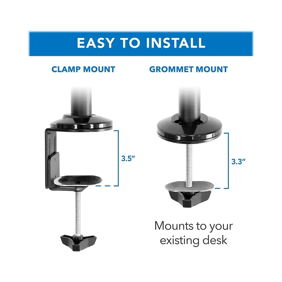 Mount your screen up to 32″ in size in either portrait or landscape orientation. The intuitive 25.7″ x 9.5″ keyboard tray underneath comes with a padded wrist rest to relieve additional stress on your wrists. Cable management system hides unwanted cables and wires from sight. The pneumatic counterbalance gas springs allow your monitor to tilt 35 degrees, swivel 180 degrees, and rotate 360 degrees so you can find the optimum viewing angles. Clamp or grommet onto your work desk.