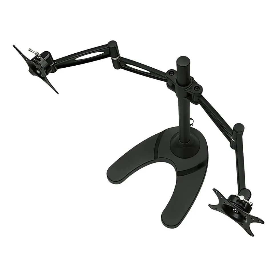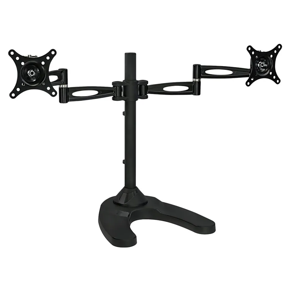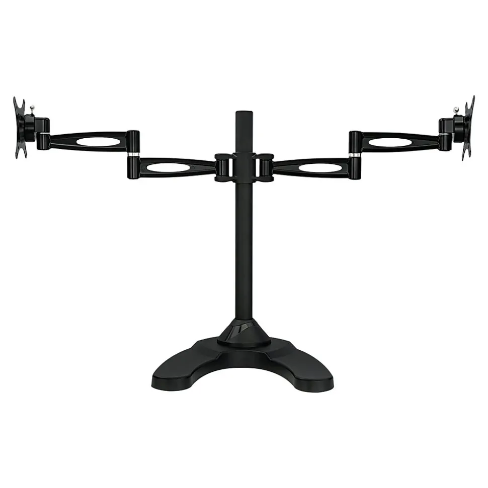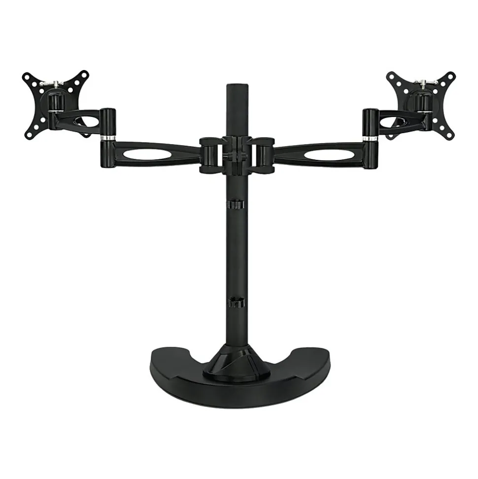 - FULLY ADJUSTABLE: Two monitor mount arms can tilt up and down 15 degrees, swivel left-right 360 degrees, raise and lower 17″ inches on the pole, and each screen can be rotated and placed in portrait or landscape orientation independent of one another.