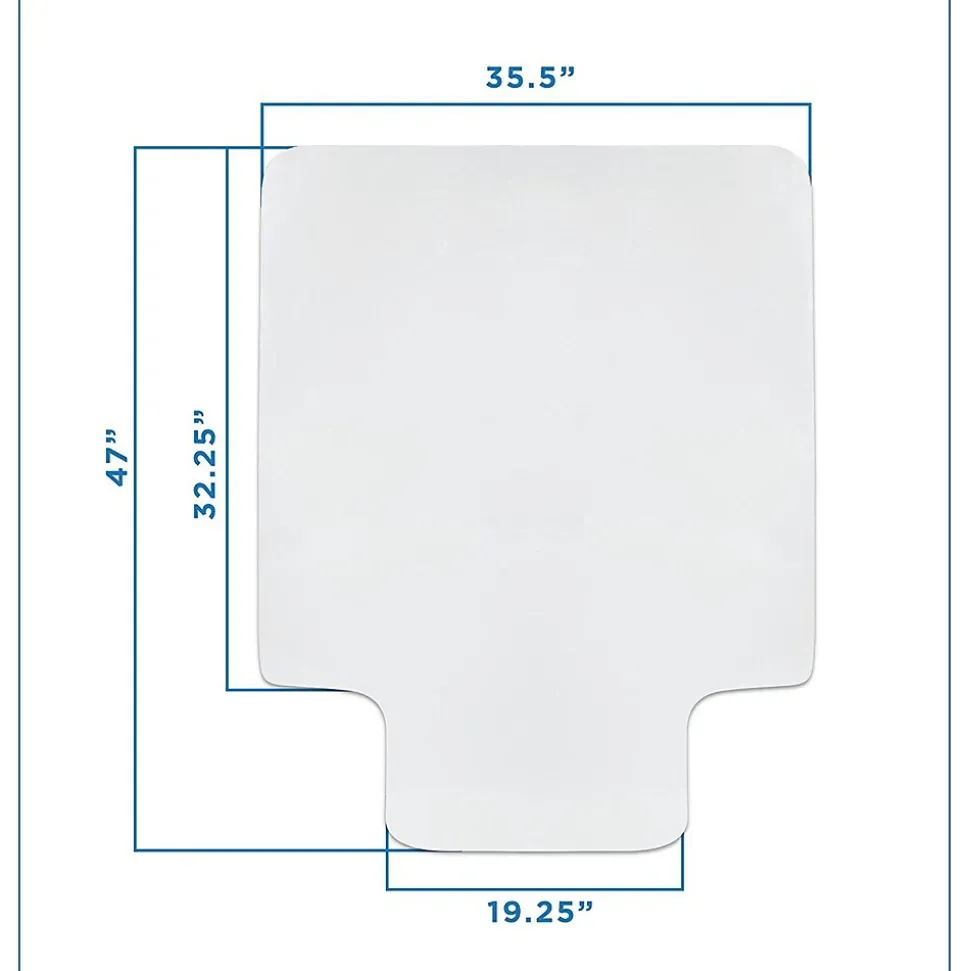 The MI-7818 mat has a smooth surface on both sides, so it is suitable for a variety of flooring including hardwood, tile, linoleum, vinyl, and even carpet! You will be able to glide across the mat smoothly so you can quickly get into a position that is most comfortable for you. Measures 35.5 inches wide x 47 inches long. The lip extension measures 19.25 inches. Lip extension protects the floor under your desk, and prevents your office chair from moving off of the mat.