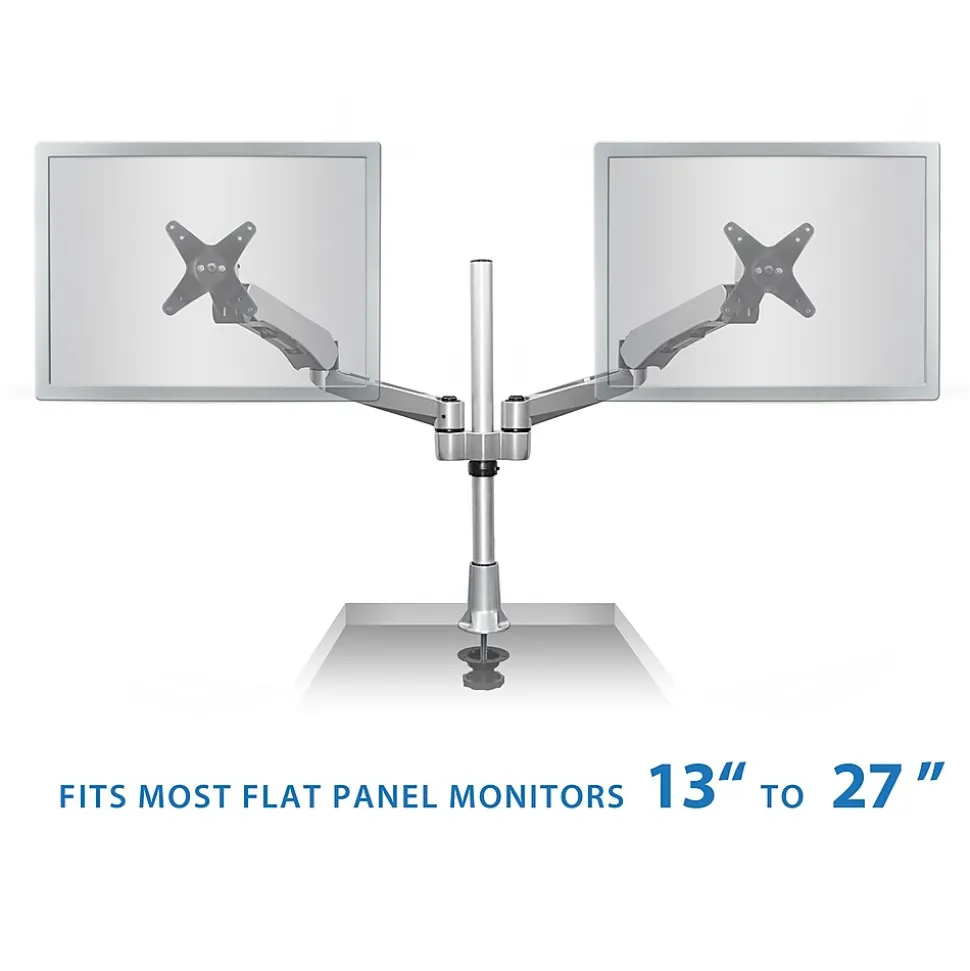 MI-45111 dual monitor mount features two gas spring arms for smooth full motion monitor adjustments. The extra long mounting pole measures 20.5”, allowing for a large height adjustment range. From height adjustment, to monitor tilt, swivel and rotation, this monitor desk mount is designed to maximize the user’s efficiency and comfort. Boost productivity and enhance workflow with double the screen space, while improving posture and clearing up more desk space by elevating the monitors. This premium dual monitor mount is fully TAA (Trade Agreements Act) compliant and is suited for purchase by the U.S. government. It is a modular monitor mount, meaning it is fully customizable with the ability to add or remove monitor-mounting arms, which allows an organization to develop cost-effective, tailored solutions for their employees’ needs. The c-clamp base easily attaches to any desk measuring.79” to 2.36” thick, making it an easy addition to any workspace. It also includes a grommet base that securely attaches to a desktop hole opening. Each arm can carry monitors measuring in size up to 32” and up to 19.8lbs per mounting arm.