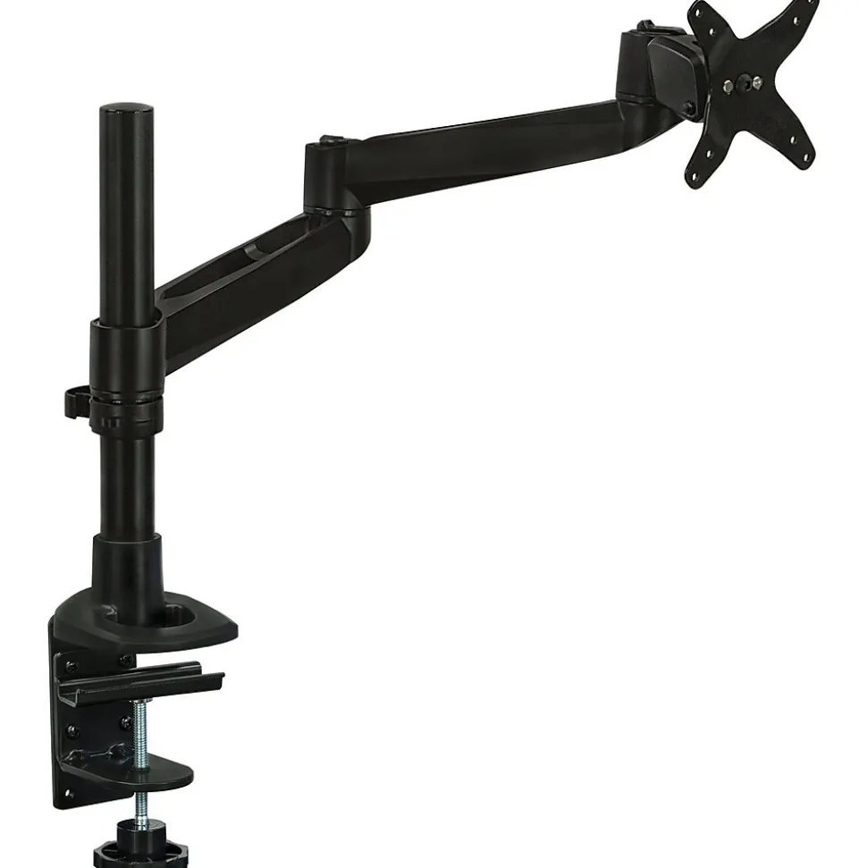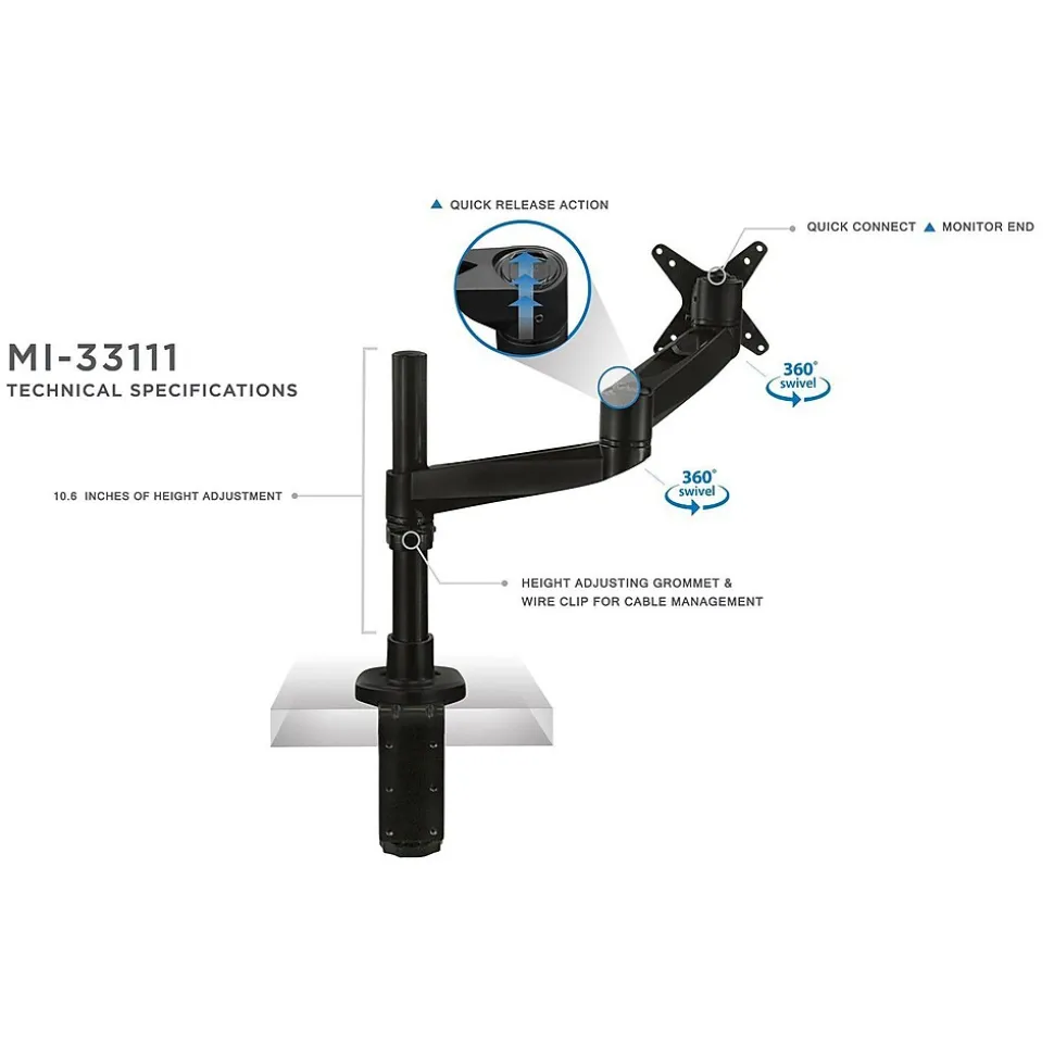 MI-33111-BLK single monitor desk mount features a single articulating arm with smooth, full motion adjustments including height, tilt, swivel and rotation. This desk mount is designed to position your monitor perfectly for a healthier, more comfortable way to work throughout the day. Save desk space while improving posture by elevating your monitor off of the desk to eye level. This premium single monitor mount is fully TAA (Trade Agreements Act) compliant and is suited for purchase by the U.S. government. It is a modular monitor mount, meaning it is fully customizable with the ability to add or remove monitor-mounting arms, which allows an organization to develop cost-effective, tailored solutions for their employees’ needs. The grommet base easily attaches to any desk up to 3.5” thick, making it an easy addition to any workspace. Fits monitors up to 32” with a weight capacity of 19.8lbs.