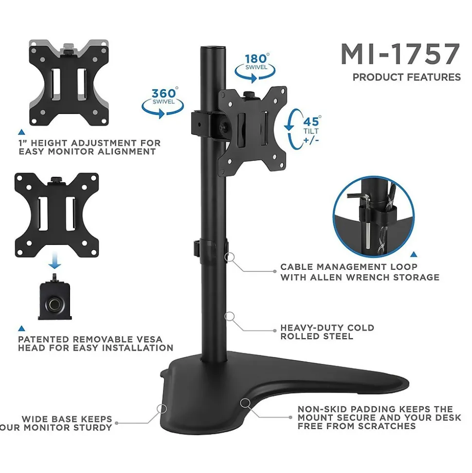 MI-1757 has full motion range allows you to get your screens to the right height, reducing strain on your eyes and back. This mount works well with a variety of brands, and can handle up to 35 pounds with ease. Just be sure that your monitor is VESA 75×75 and 100×100 compatible, and you will be golden! Keep your desk looking extra tidy thanks to the cable management clips located underneath each arm. Installation is a breeze, and we provide the manual as well as the necessary hardware.