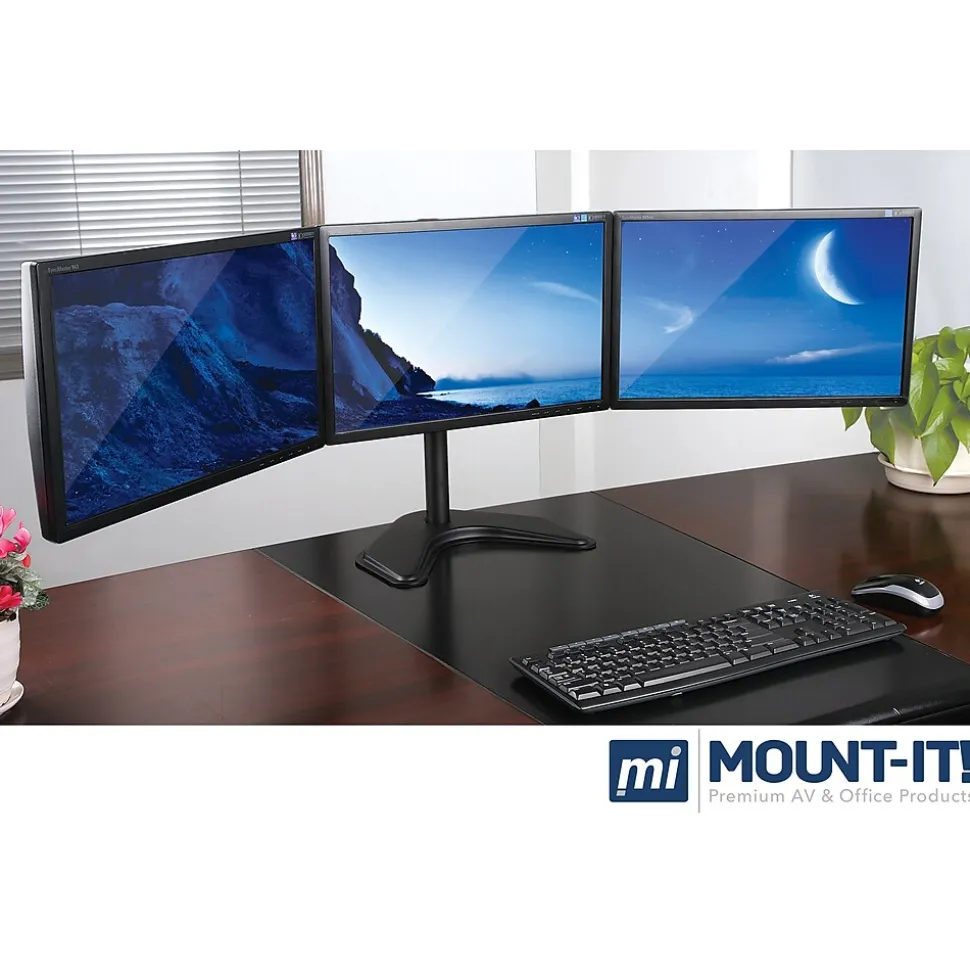 Mount-It! MI-2789 triple arm (horizontal) monitor mount and stand allows you to clear out your desk space, while providing ergonomic monitor installation height. Say good bye to neck and should pain and increase your productivity with three screens. Heavy duty stand and pole design makes this three monitor mount sturdy. Economical and dependable, mechanical monitor arms allow several height options for placing your monitor in the best ergonomic position, while offering more desktop space. The double link swing arms that support the monitors can be adjusted on the vertical tube for the best height adjustment. The arms that support the monitors can be adjusted on the vertical tube for the best height adjustment. Articulating arms on the sides allow swivel function up to 360 degrees with 45 down and 80 up degrees of tilt at the mounting panel.
