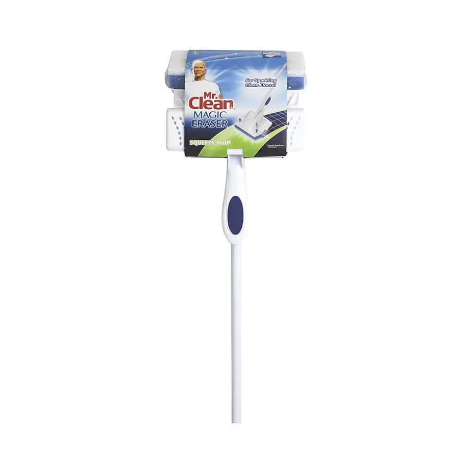 Bring the cleaning power of a Magic Eraser to a floor surface with this blue and white mop. Its deep penetrating action helps lift away dirt and grime to leave spaces looking clean, and the squeeze function allows for easy removal of excess water. This Mr. Clean mop is versatile enough to use on vinyl, tile, marble, stone, and no-wax floors.
