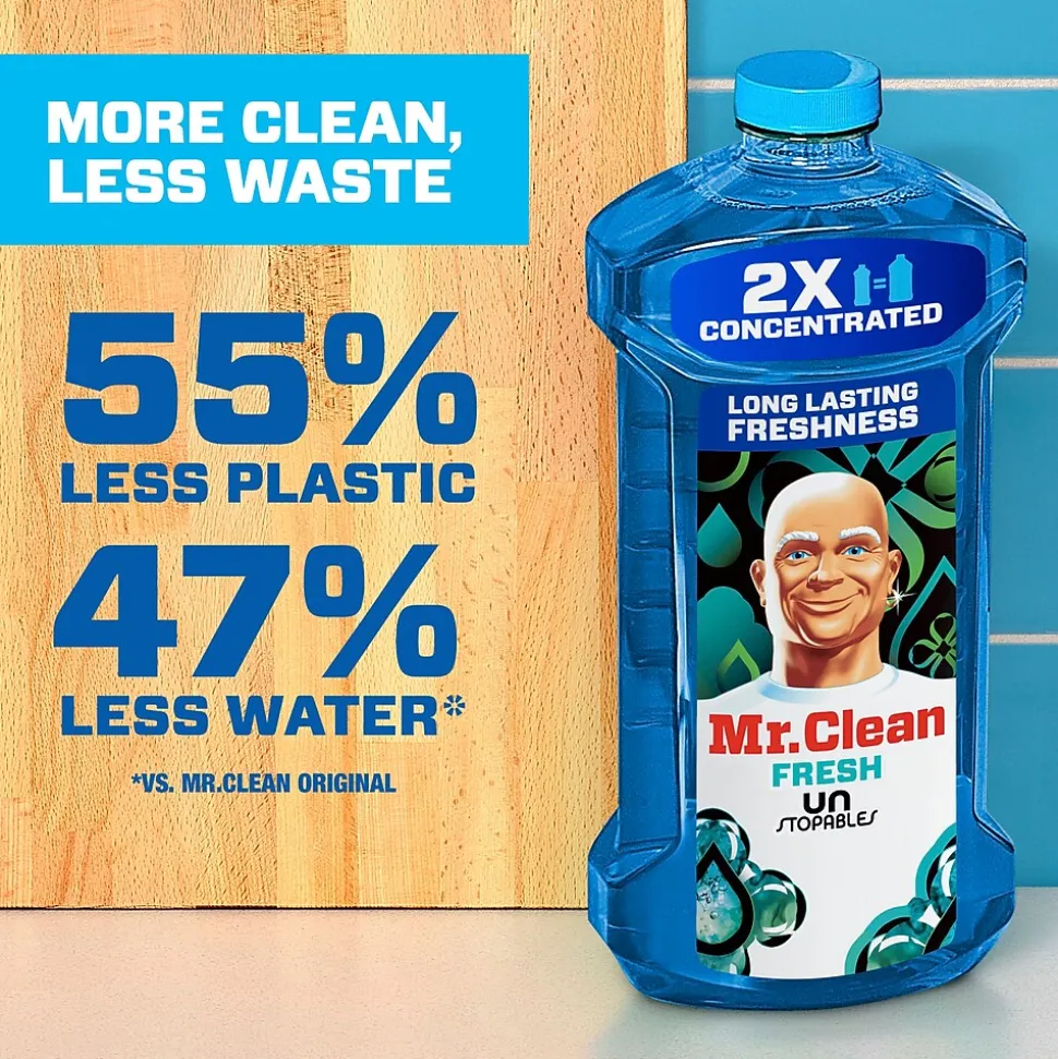 Get a powerful clean and a great scent with the Mr. Clean multi-surface cleaner with Unstopables Fresh scent. It cuts through 100% of dirt, grease, and grime, leaving the scent of Unstopables Fresh liquid cleaner in its dirt-forsaken place. It works all around the house on everything from linoleum to tile and finished hardwood floors, to toilets and bathtubs, and even garbage cans.